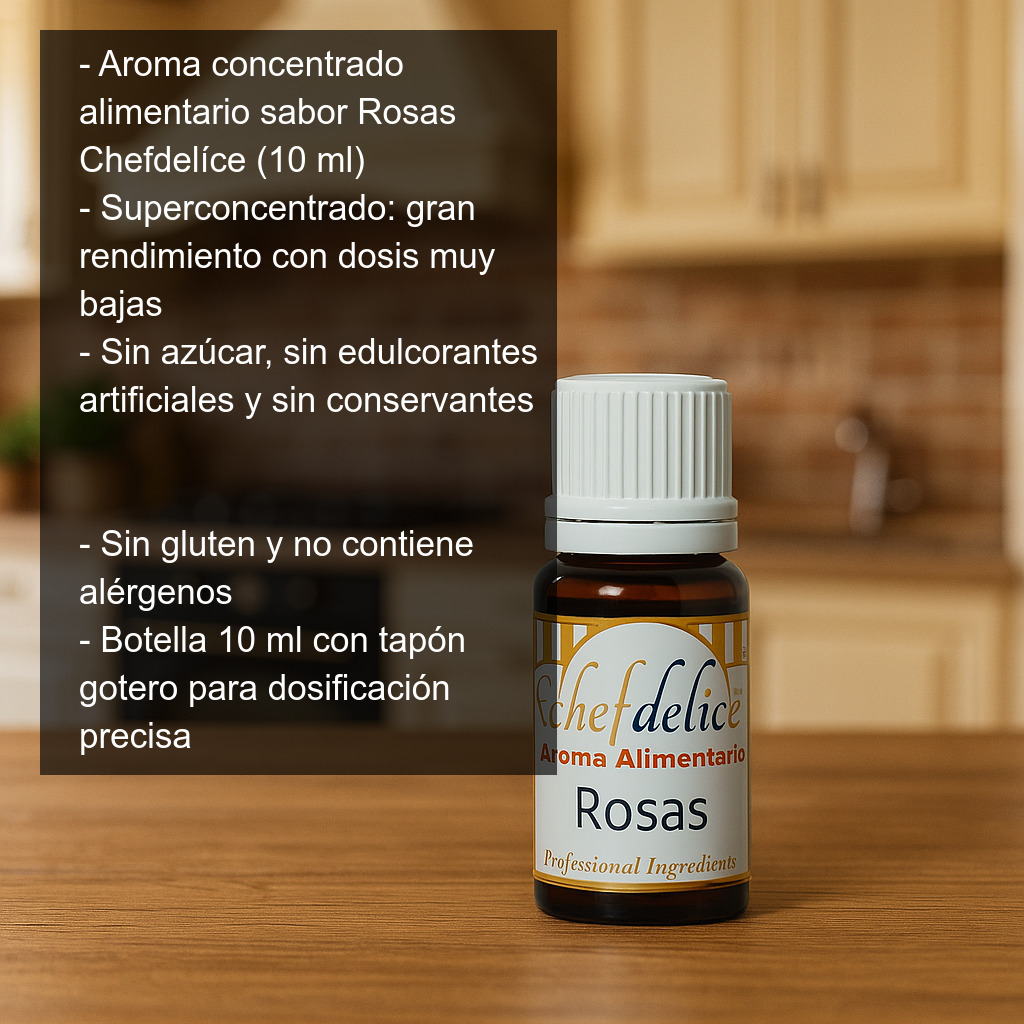 Este aroma de rosas Chefdelíce está pensado para uso profesional y doméstico: se integra fácilmente en mezclas y permite aromatizar tanto masas como cremas, bebidas y preparaciones frías. Es una opción excelente para quienes buscan un aroma alimentario de rosas de alta calidad para repostería creativa.