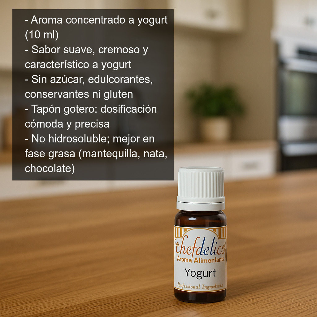 Ideal tanto para repostería casera como para pastelería creativa, este aroma concentrado te permite conseguir un sabor a yogurt limpio y agradable, manteniendo la textura y el dulzor de tu receta bajo control.