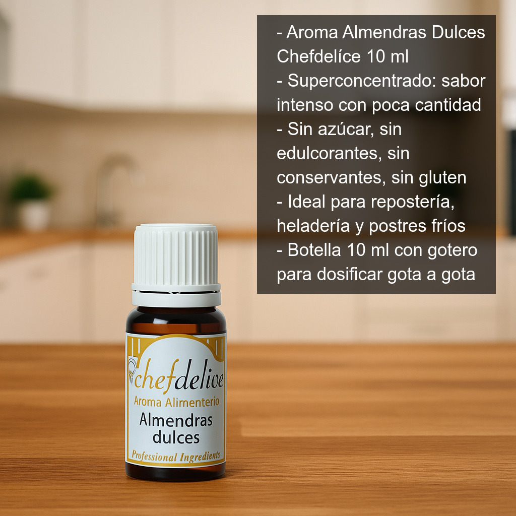 Aroma alimentario concentrado sabor Almendras Dulces (10 ml), ideal para dar un toque auténtico y elegante a tus elaboraciones de repostería y heladería. Este aroma superconcentrado está pensado para aportar un sabor “redondo” e intenso con una cantidad mínima, logrando resultados profesionales sin alterar la textura de la masa o la crema.