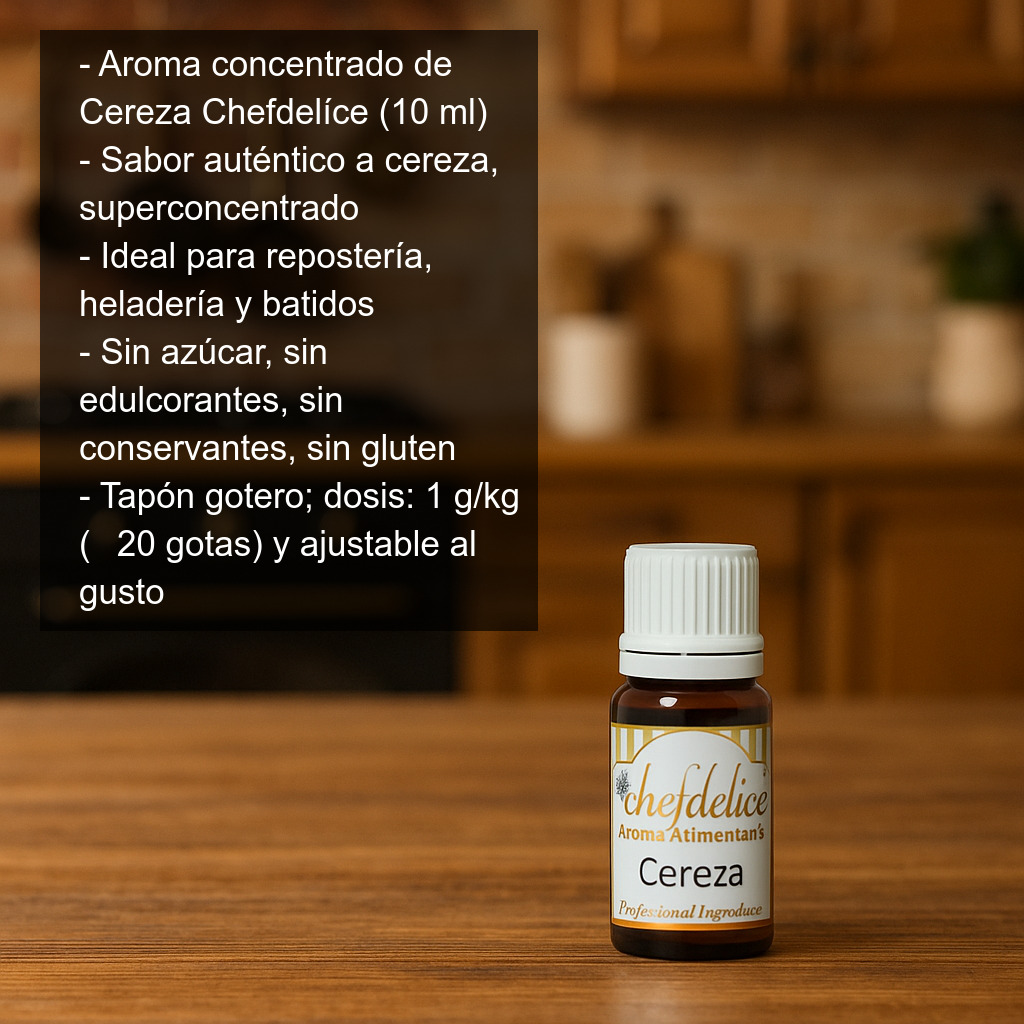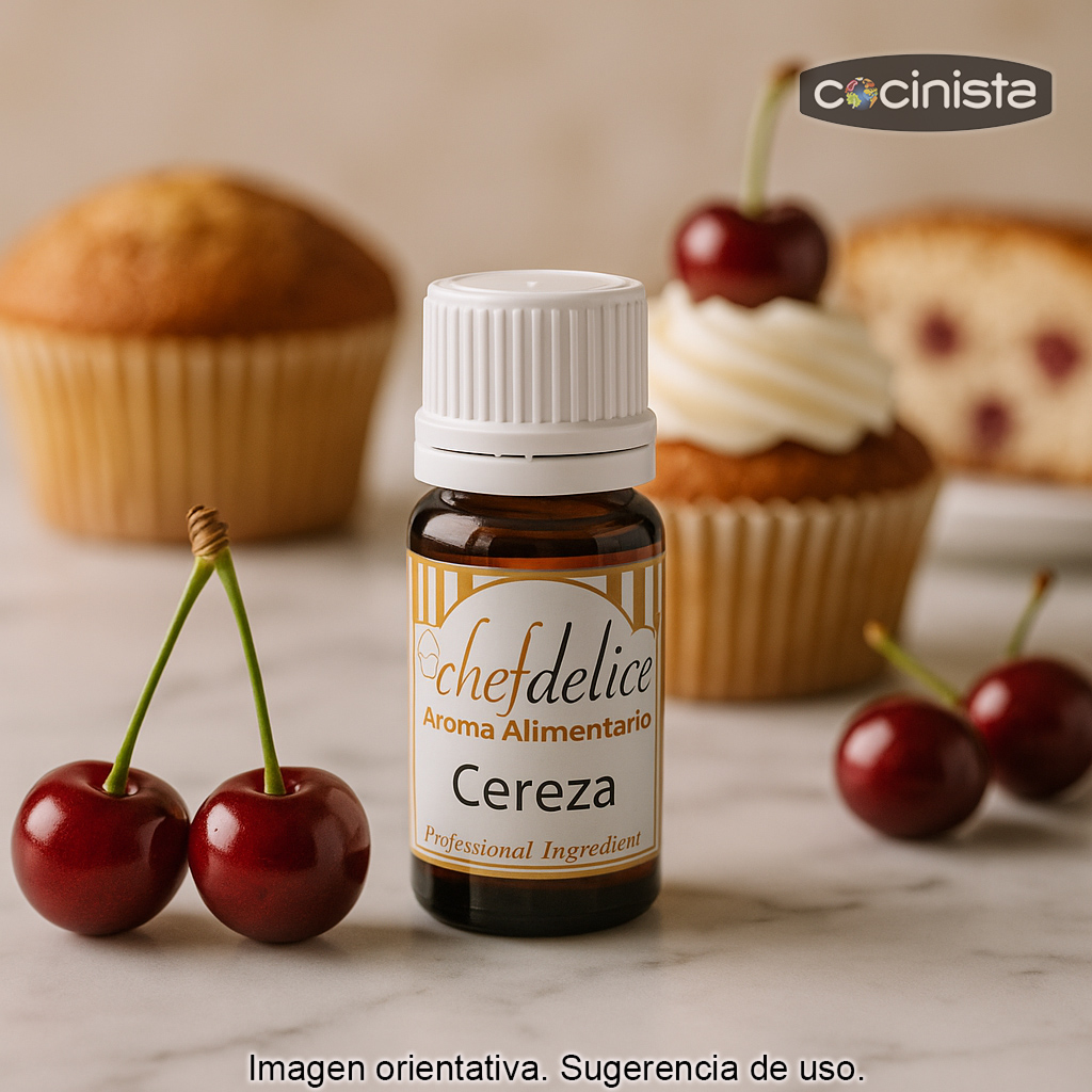 Aroma concentrado de Cereza (10 ml) para repostería y postres: un aroma alimentario superconcentrado con auténtico sabor a cereza, ideal para dar un toque intenso y “redondo” a tus elaboraciones con muy poca cantidad. Perfecto para aromatizar bizcochos, magdalenas, cupcakes, galletas, fondant, frosting, cremas, batidos, helados y otras preparaciones de pastelería y heladería.