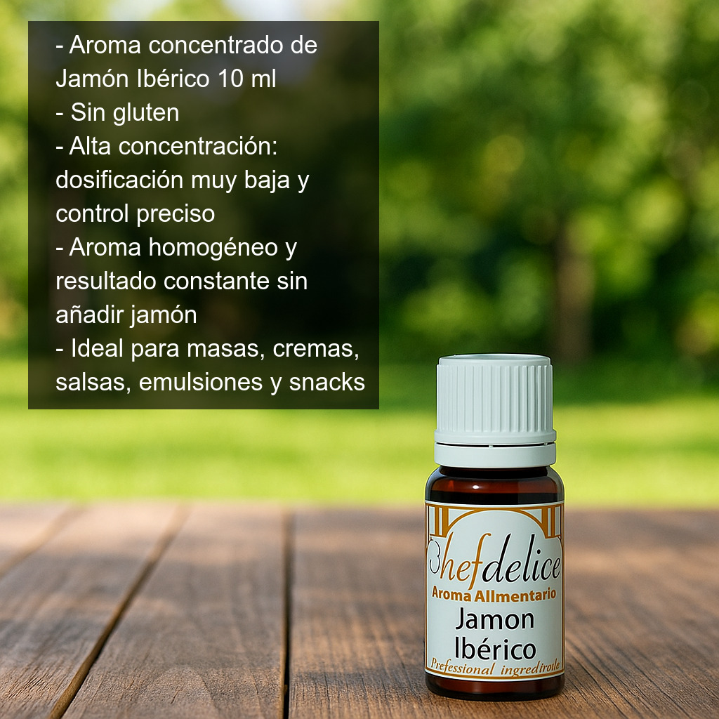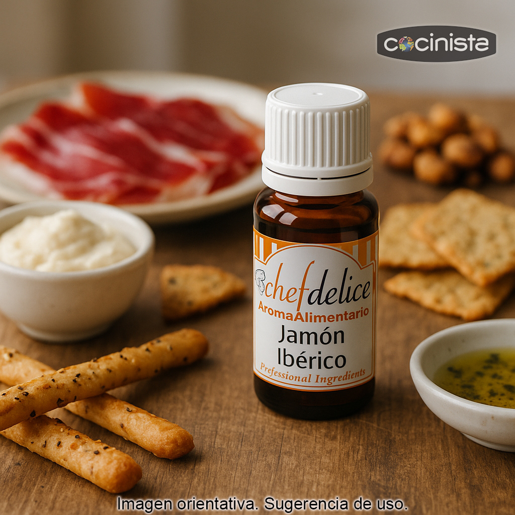 El aroma concentrado de Jamón Ibérico es un ingrediente profesional pensado para aportar a tus recetas un intenso aroma a jamón ibérico de forma rápida, precisa y homogénea. Ideal para dar un toque gourmet a elaboraciones saladas (y también a propuestas creativas) sin necesidad de incorporar jamón en la receta, manteniendo un resultado constante en cada preparación.