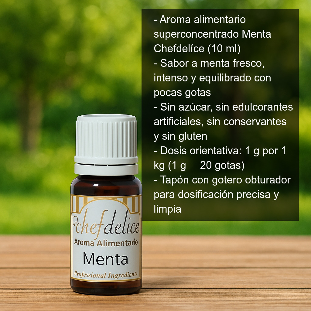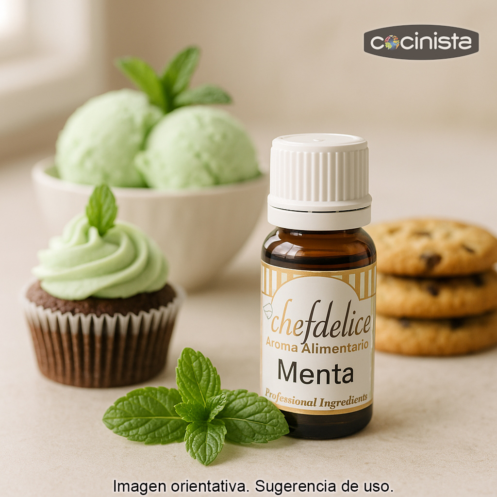 Aroma alimentario superconcentrado sabor Menta (10 ml), perfecto para dar un toque fresco e intenso a tus elaboraciones de repostería y postres. Con unas pocas gotas conseguirás un sabor a menta equilibrado y “redondo”, ideal tanto para recetas caseras como para uso profesional.