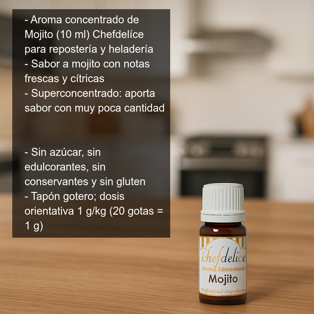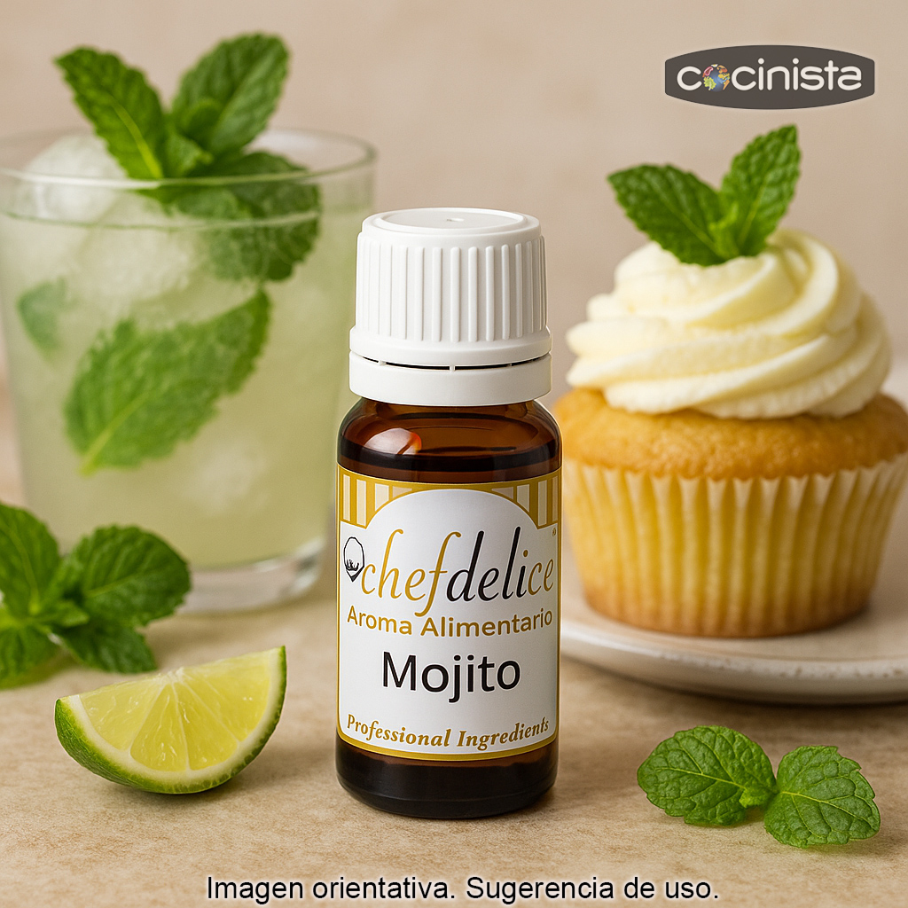 Aroma concentrado de Mojito (10 ml) para repostería creativa y heladería. Este aroma alimentario superconcentrado reproduce el sabor característico del mojito, con sus notas frescas y cítricas, ideal para dar un toque diferente a tus elaboraciones dulces y bebidas.