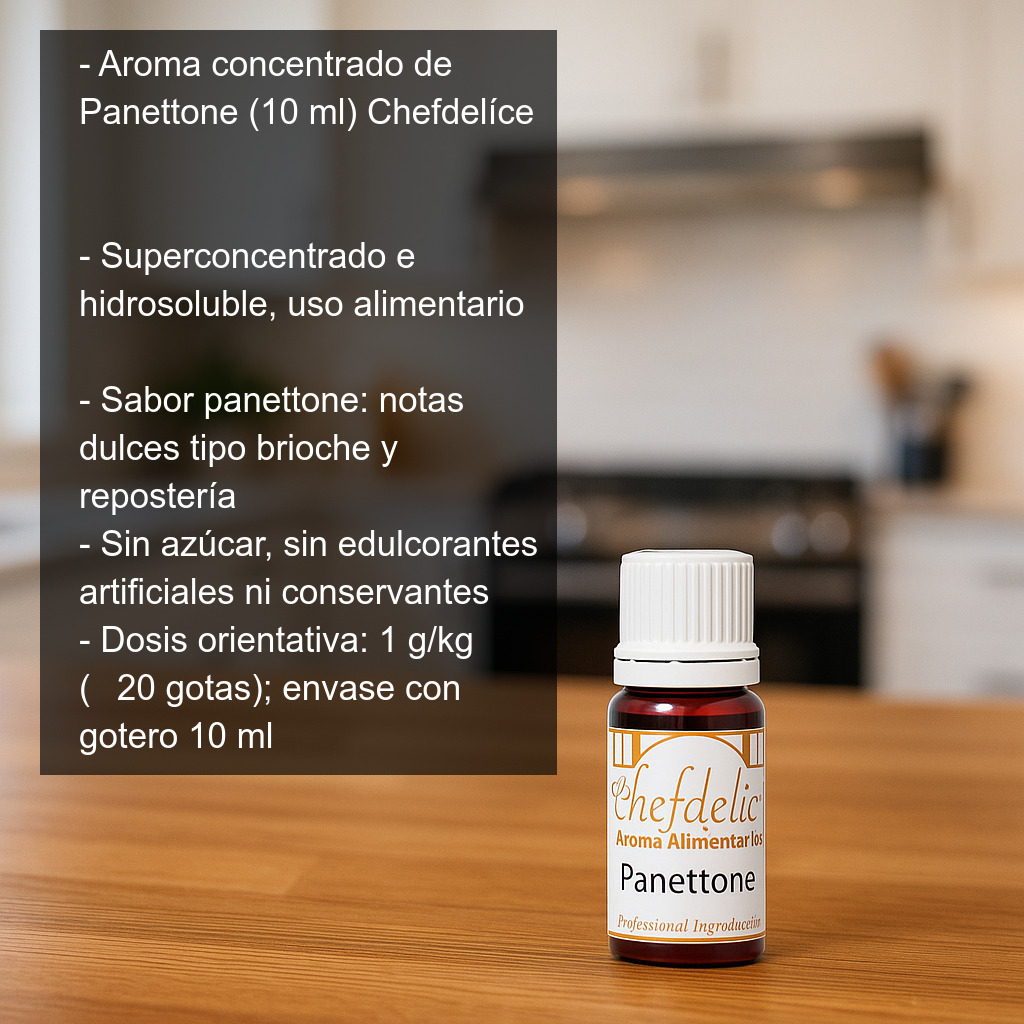 Aroma concentrado de Panettone (10 ml) para uso alimentario, superconcentrado e hidrosoluble, perfecto para aportar el inconfundible sabor del panettone italiano (notas dulces tipo brioche con matices característicos de repostería) a tus elaboraciones con una cantidad mínima. Ideal tanto para recetas caseras como para obrador, ya que se integra fácilmente en masas, cremas y mezclas líquidas.