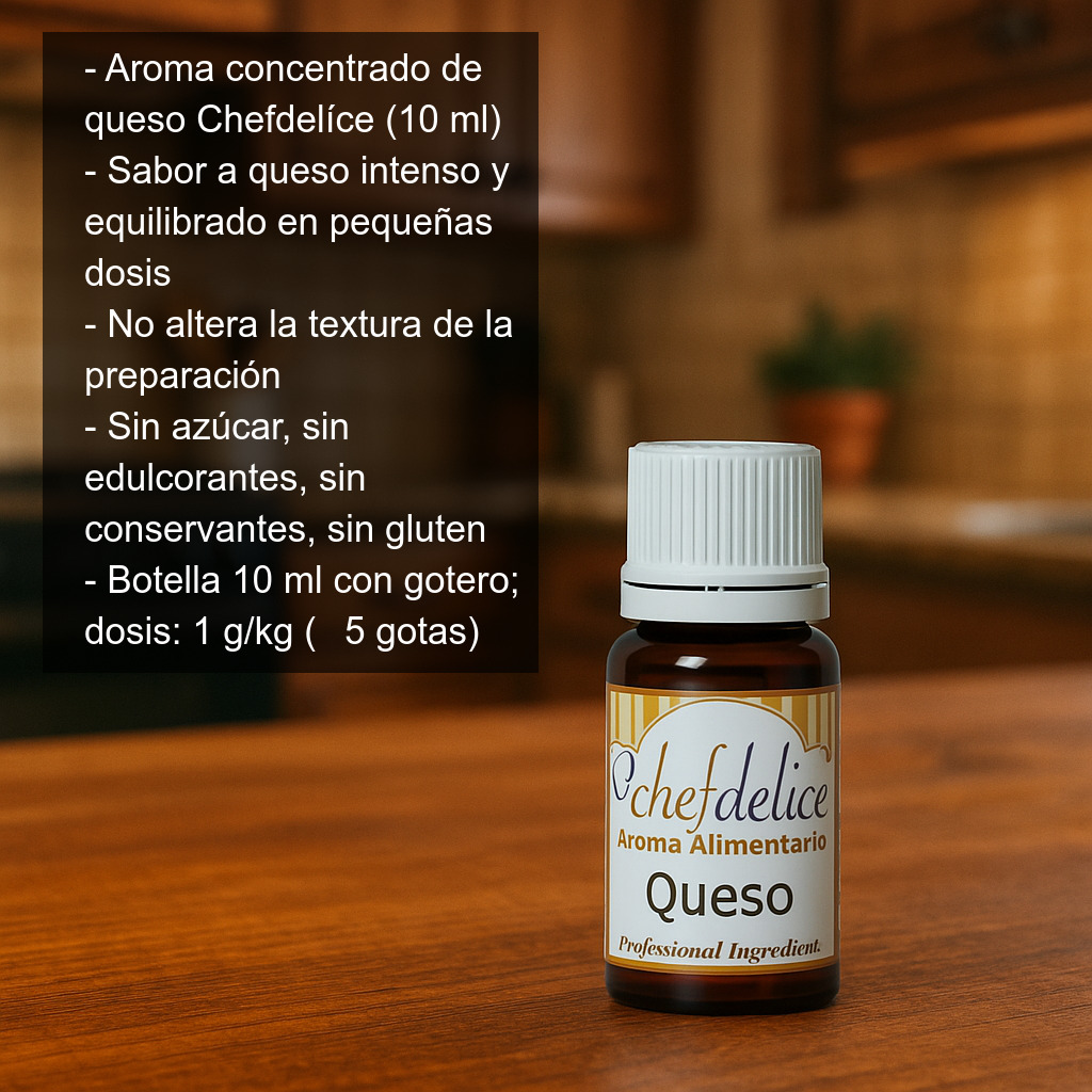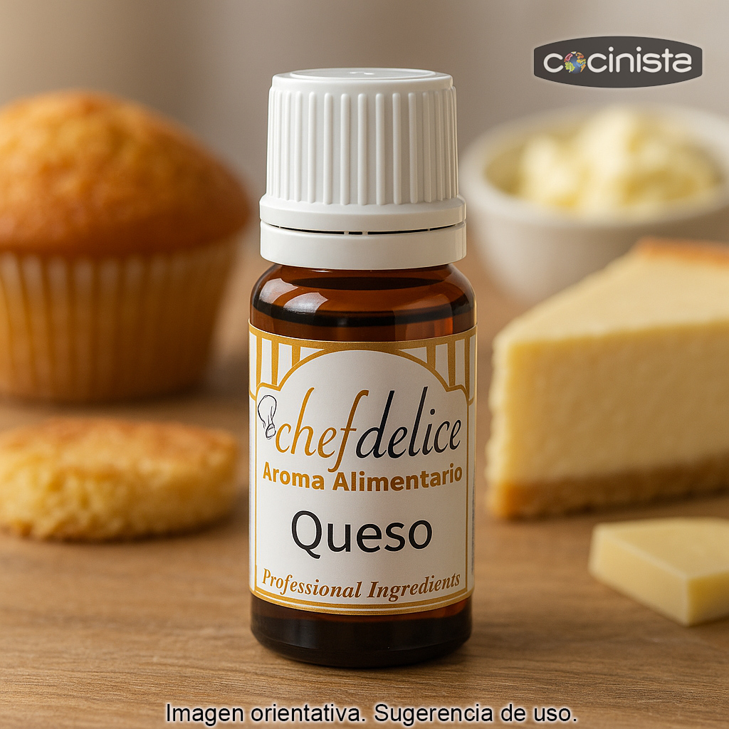 Aroma concentrado de queso (10 ml) para dar un auténtico sabor a queso a tus recetas dulces y saladas. Este aroma alimentario superconcentrado está pensado para usar en pequeñas dosis y conseguir un resultado intenso, equilibrado y “redondo” sin alterar la textura de la preparación.
