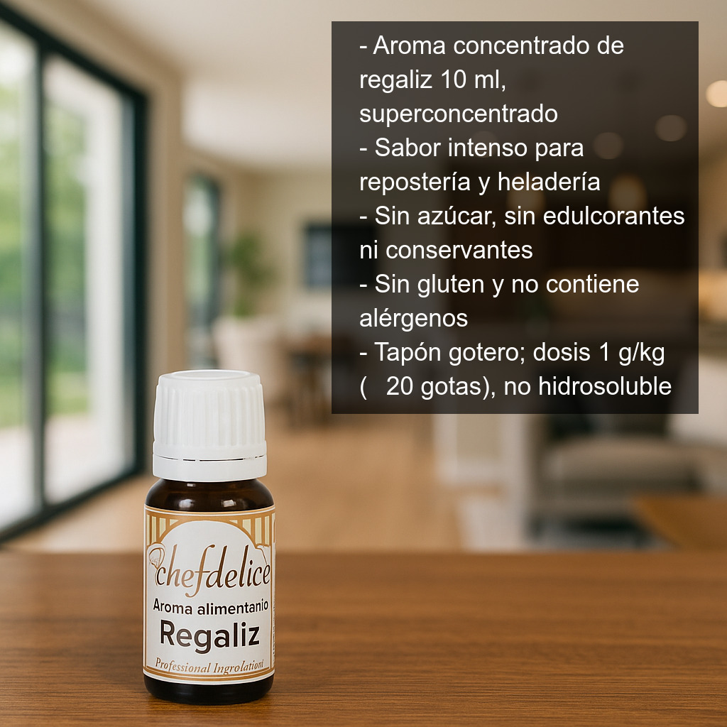 Ideal para aromatizar bizcochos, magdalenas, galletas, cupcakes, batidos, cremas, frosting, fondant, helados y otras preparaciones donde quieras un toque a regaliz. También es una excelente opción para dar personalidad a rellenos, masas y coberturas, especialmente en recetas de chocolate, vainilla o anís.
