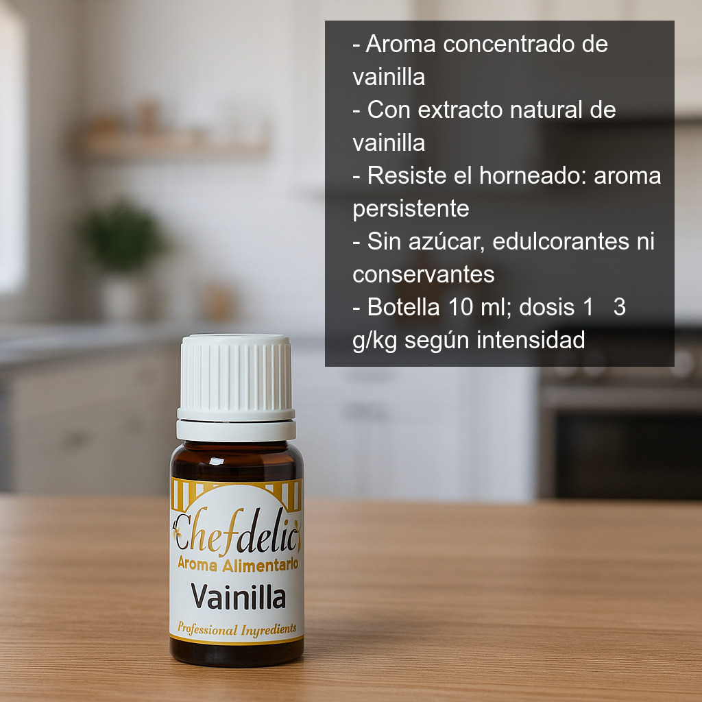 El aroma concentrado de vainilla es ideal para aportar a tus recetas un sabor intenso y auténtico a vainilla natural. Elaborado con extracto natural de vainilla, ofrece una nota aromática profunda y persistente que mantiene su potencia incluso tras el horneado, por lo que resulta perfecto tanto para preparaciones en frío como para masas y cremas que van al horno.