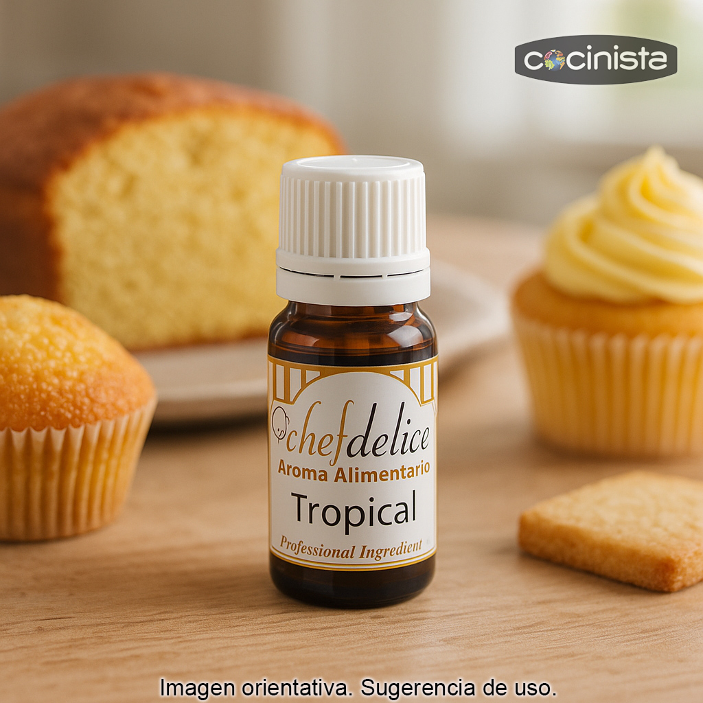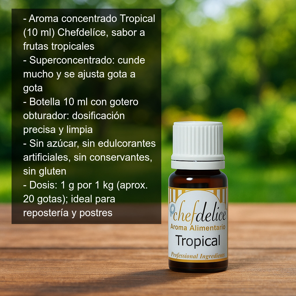 Aroma concentrado Tropical (10 ml) para dar un delicioso sabor a frutas tropicales a tus recetas de repostería y postres. Este aroma alimentario superconcentrado está pensado para aportar un toque intenso y equilibrado con muy poca cantidad, por lo que cunde mucho y resulta perfecto tanto para uso doméstico como para elaboraciones más profesionales.
