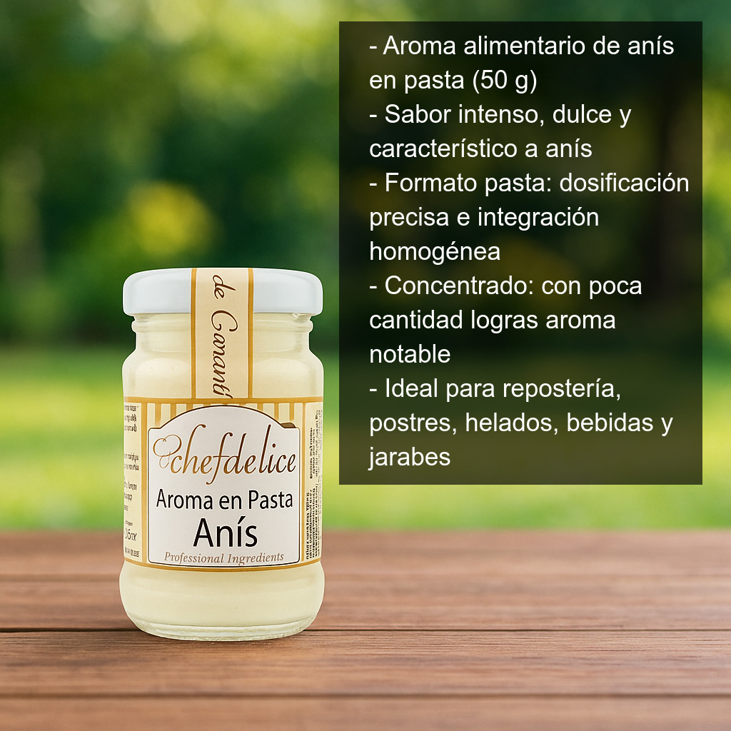 Aroma alimentario de anís en pasta (50 g) para dar un toque intenso, dulce y característico a tus elaboraciones. Este aroma de anís está formulado en formato pasta, lo que facilita una dosificación precisa y una integración homogénea en masas y mezclas. Además de aportar sabor, puede contribuir a realzar el aspecto final de tus preparaciones.