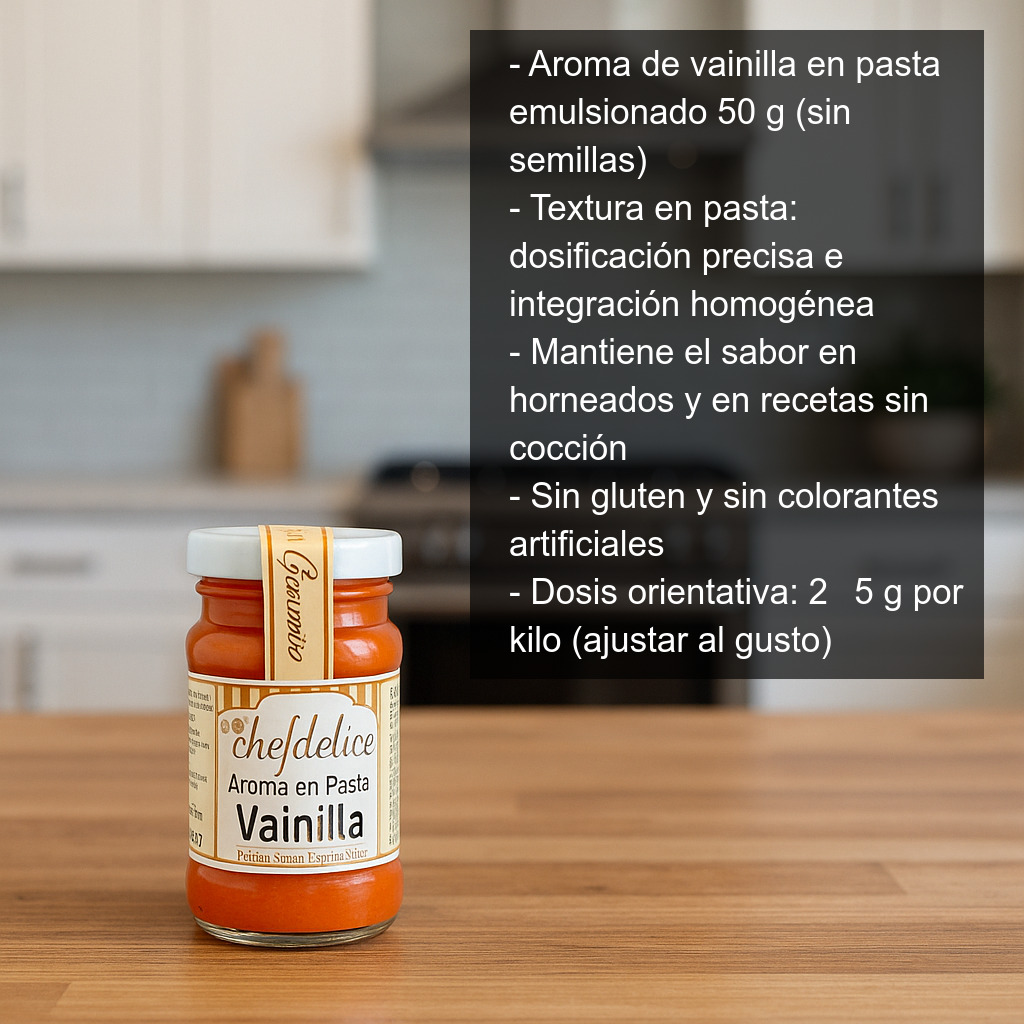 Este aroma de vainilla en pasta es ideal para quienes buscan un acabado profesional en casa o en obrador: se mezcla fácilmente y mantiene el sabor en horneados y en recetas sin cocción. Perfecto para realzar el perfil aromático de postres clásicos y modernos sin necesidad de utilizar vaina o extracto.