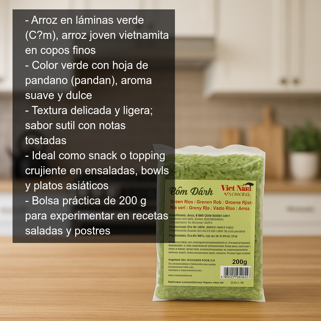 El arroz en láminas verde, también conocido como C?m (arroz verde vietnamita), es una especialidad tradicional elaborada a partir de arroz recolectado muy joven. Tras la cosecha, los granos se cocinan en pequeñas partidas y se aplastan cuidadosamente para obtener copos finos y ligeros, de textura delicada y un sabor sutil con notas tostadas muy agradables.