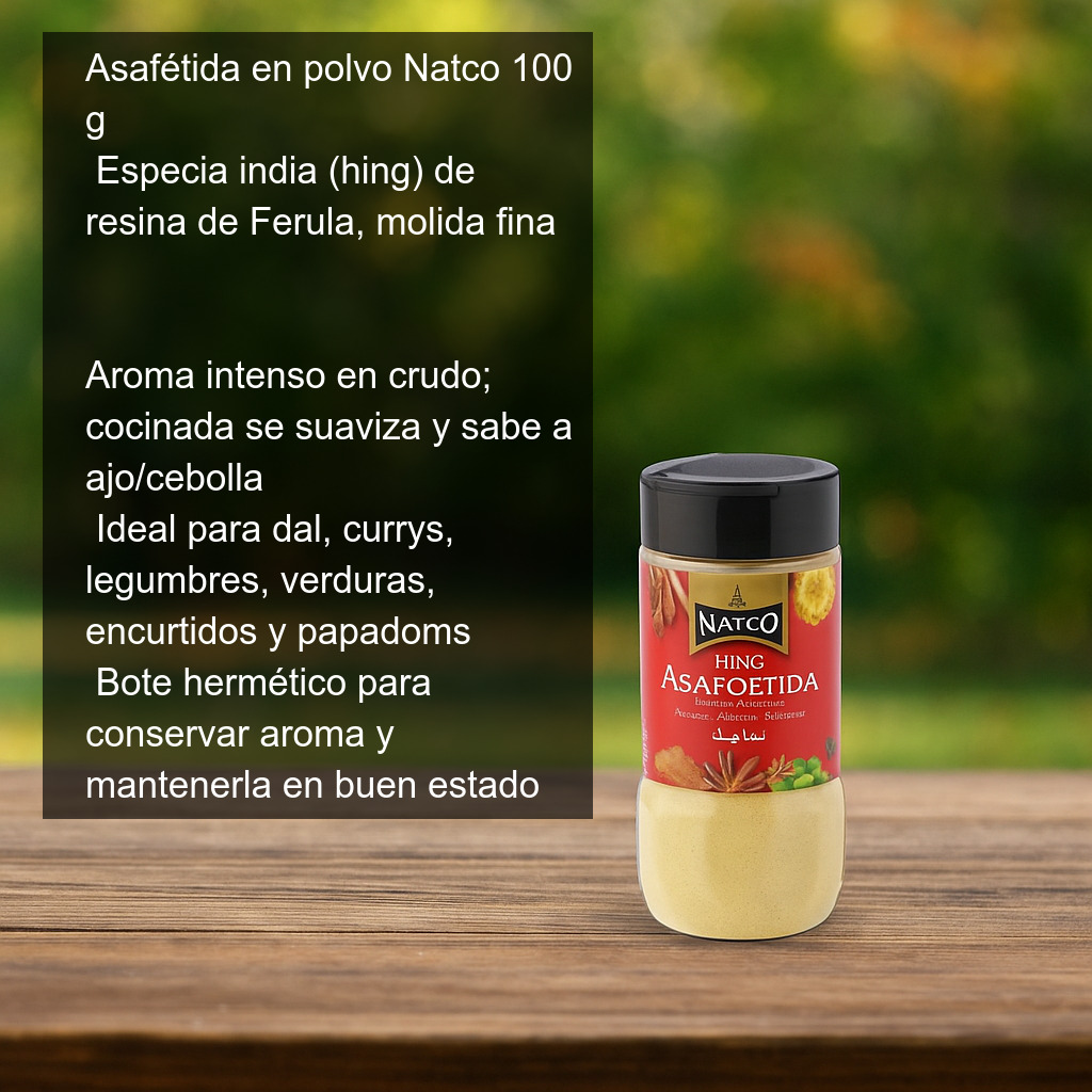 La asafétida (también conocida como assafoetida o hing en la India) es una especia imprescindible en la cocina india y en muchas recetas vegetarianas y veganas. Se obtiene a partir de la resina solidificada de un arbusto (género Ferula), que se seca y se muele hasta conseguir un polvo fino. Tradicionalmente se ha utilizado también como digestivo y en contextos sociales y religiosos.