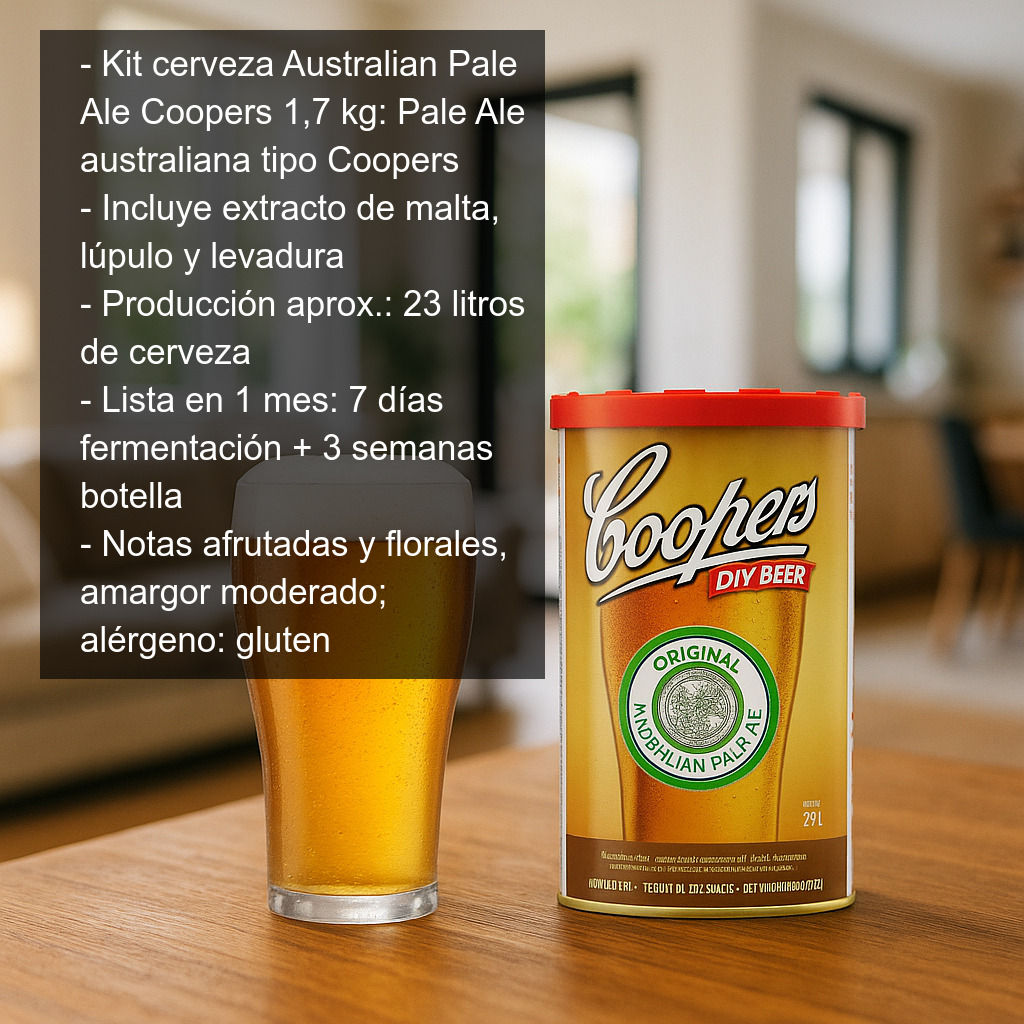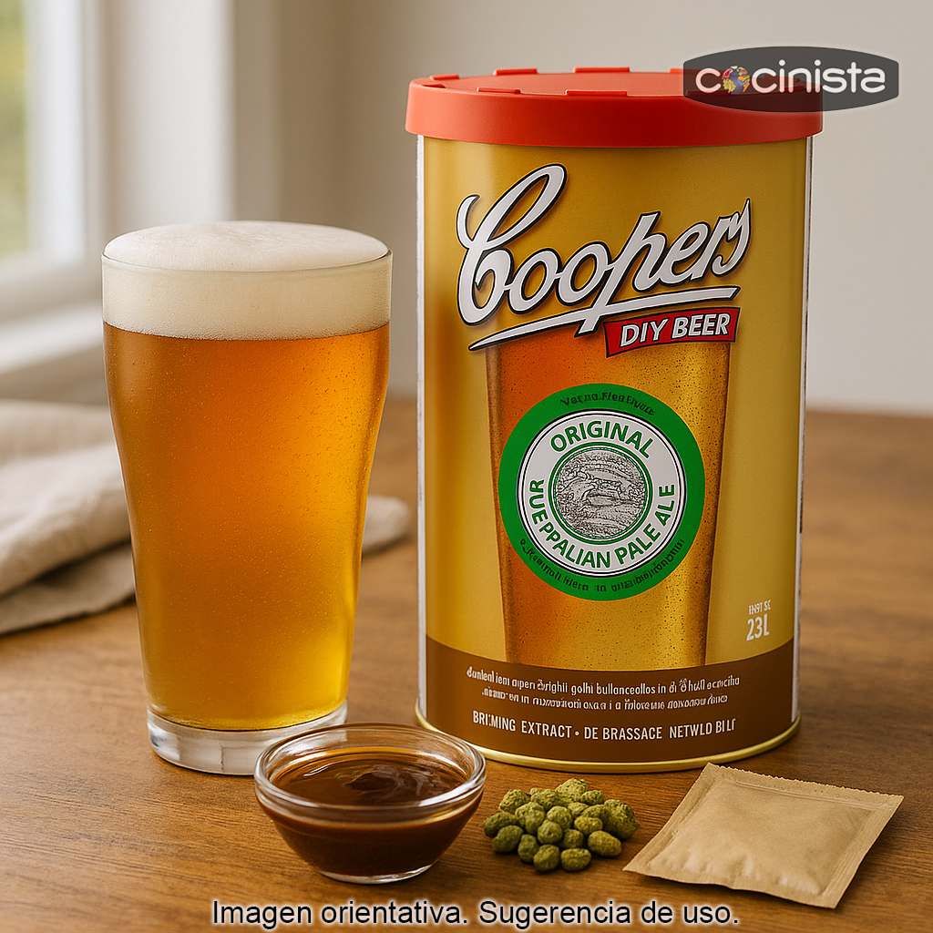 El kit de cerveza Australian Pale Ale Coopers (1,7 kg) es una forma sencilla y fiable de elaborar en casa una auténtica Pale Ale australiana, inspirada en la mítica Coopers Original Pale Ale, todo un icono entre los amantes de la cerveza. Ideal tanto si estás empezando en el mundo del homebrewing como si buscas un resultado consistente con el sello de una marca histórica.
