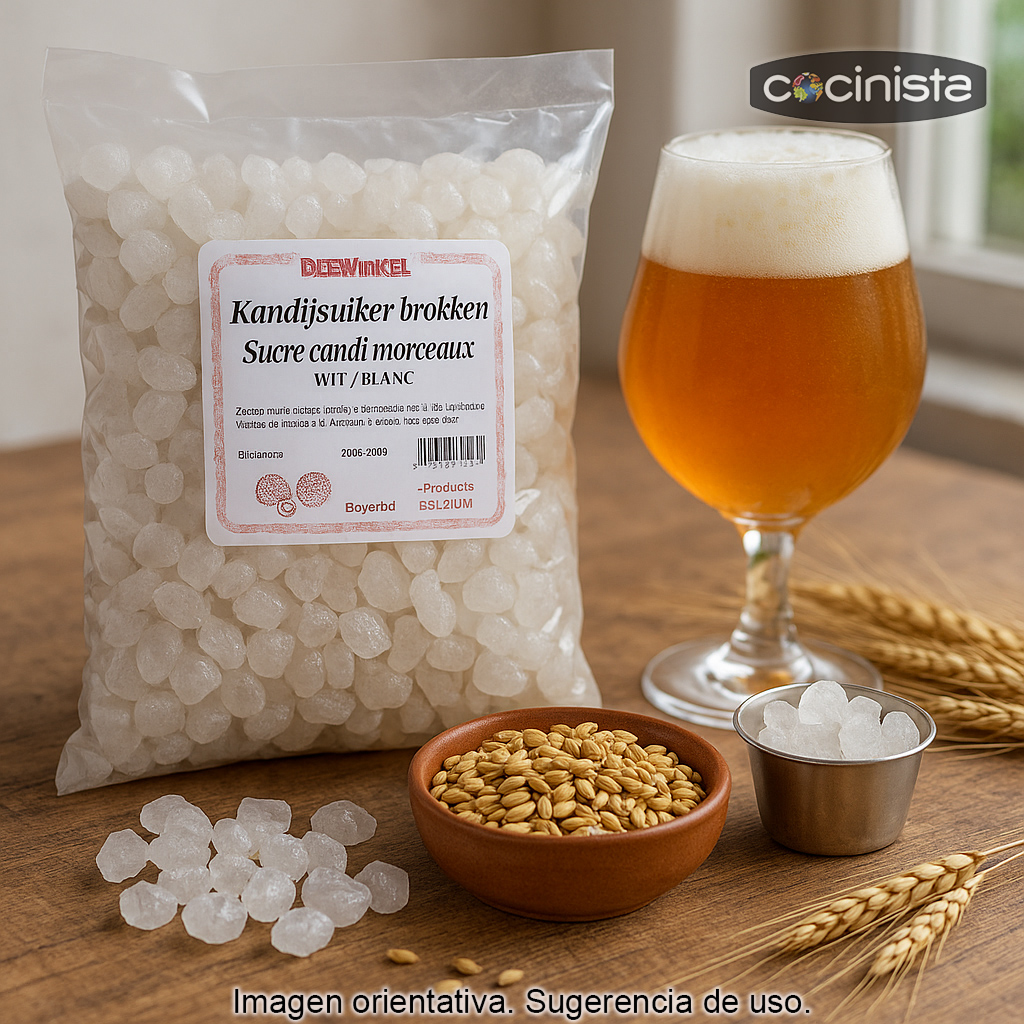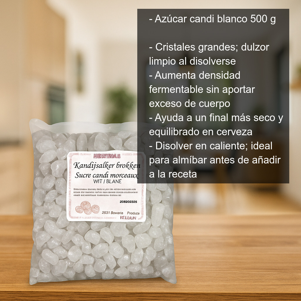 El azúcar candi blanco (también conocido como sugar candi) es un ingrediente clásico en la elaboración de cervezas belgas y otras recetas de fermentación. Se obtiene a partir de cristales de azúcar de gran tamaño que, al disolverse, aportan un dulzor limpio y ayudan a conseguir un perfil más seco y equilibrado en la bebida final.