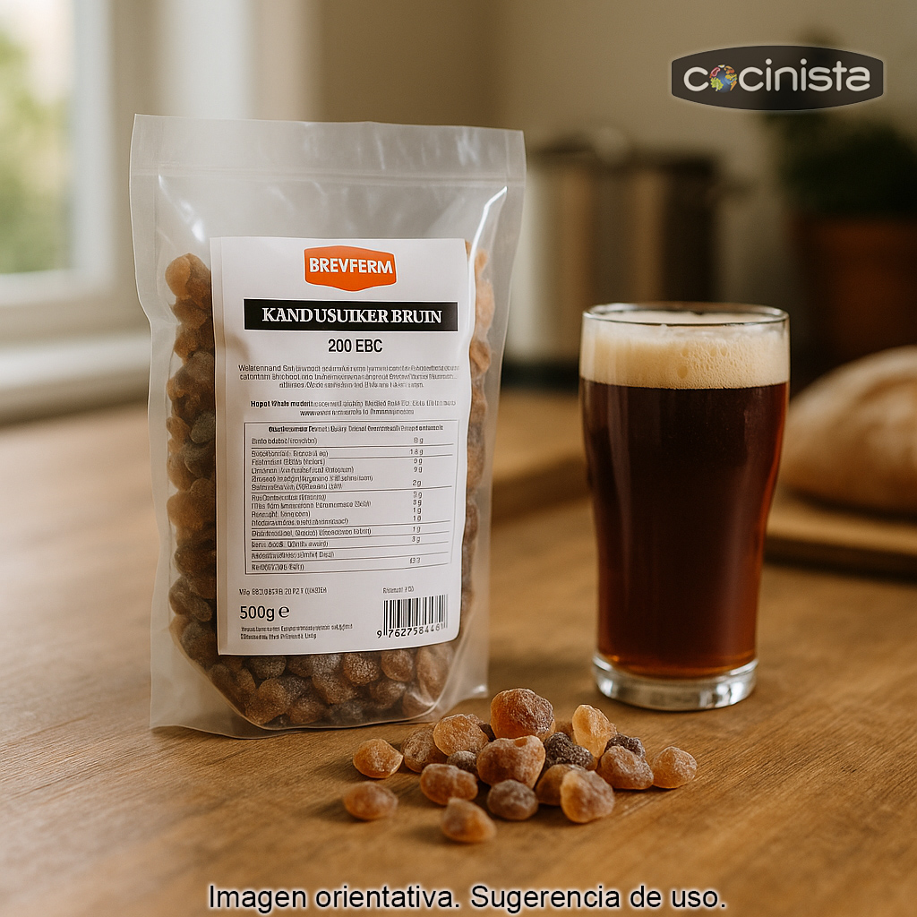 El azúcar candi morena (también conocido como sugar candi) es un ingrediente clásico en la elaboración de cerveza belga y en muchas recetas de cerveza artesanal donde se busca aportar matices de sabor, mejorar la fermentación y ajustar el perfil final de la bebida. Se obtiene a partir de grandes bloques de azúcar cristalizada y, al añadirse al mosto, contribuye a una fermentación más completa, ayudando a elevar la graduación alcohólica sin incrementar en exceso el cuerpo.