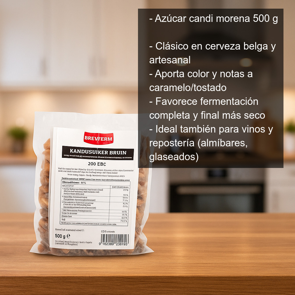 La versión morena destaca por aportar, además de dulzor, un toque de color y un perfil aromático más profundo que el candi blanco. En cerveza puede contribuir a tonos más ámbar/cobrizos y a notas que recuerdan a caramelo y azúcar tostado, ideales para estilos belgas y cervezas de mayor complejidad.