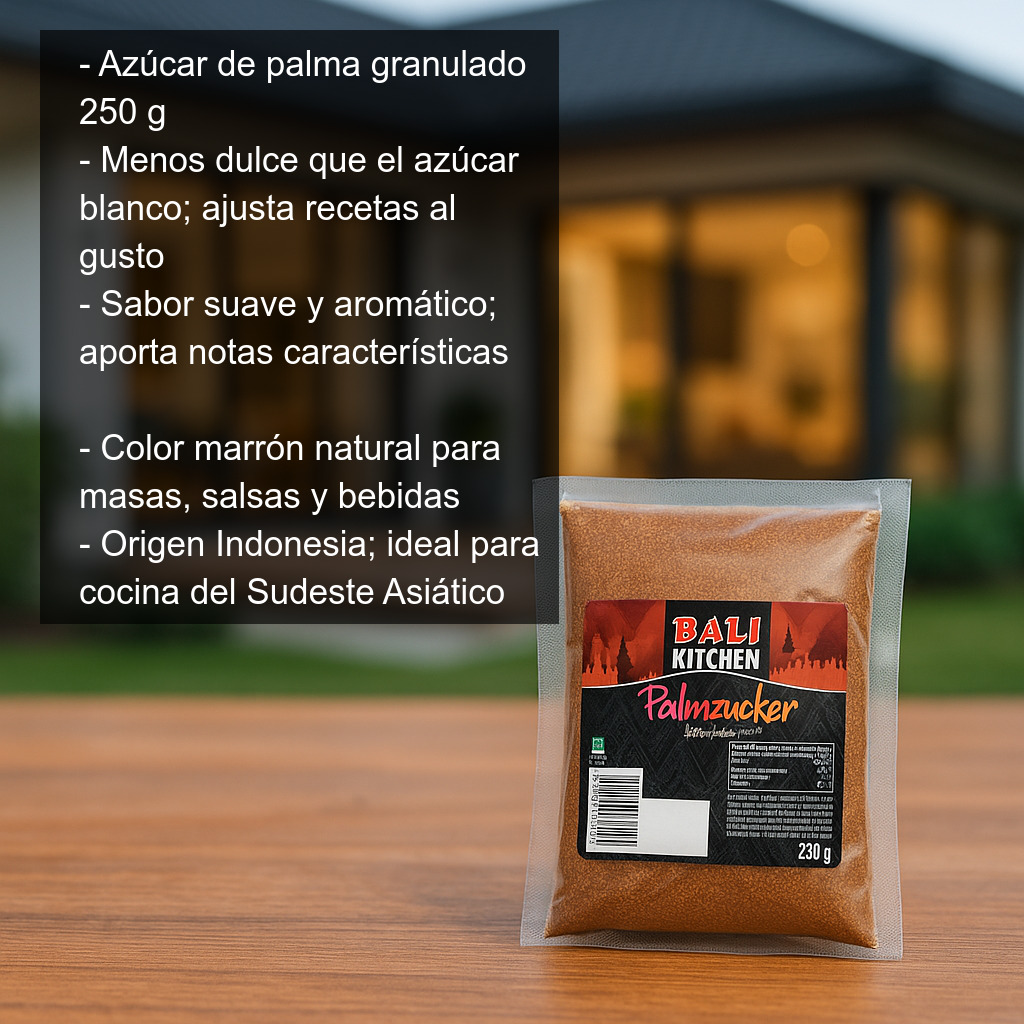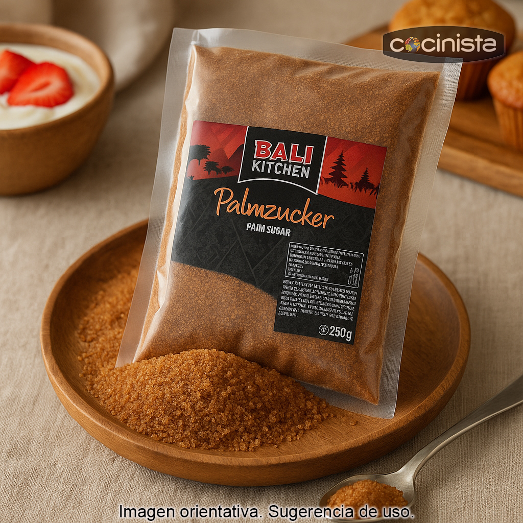 Este azúcar de palma se obtiene tradicionalmente a partir de la savia de palmeras, que se concentra y se granula para lograr una textura cómoda de dosificar y mezclar. Es un ingrediente muy utilizado en la cocina del Sudeste Asiático y resulta perfecto para dar un toque diferente a preparaciones dulces y saladas.
