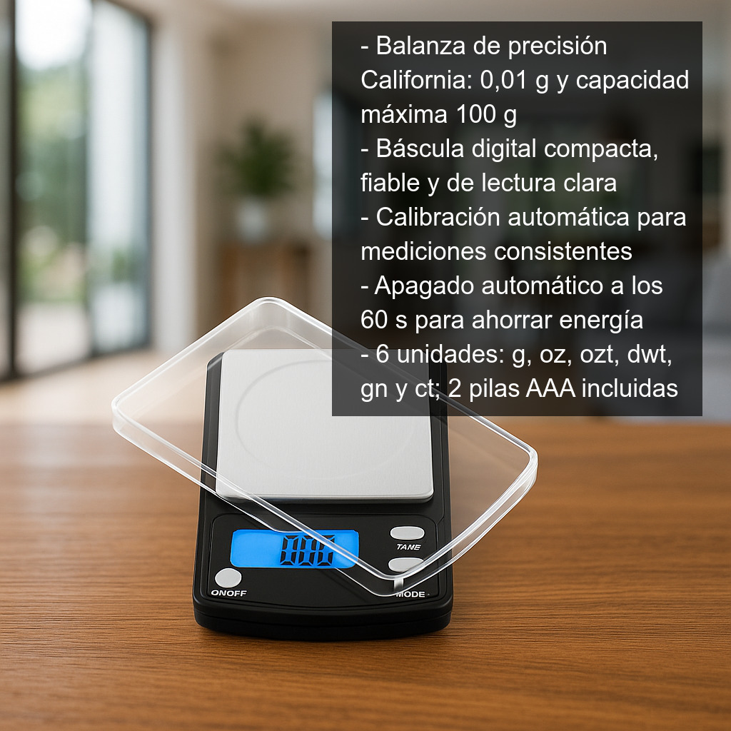 La balanza de precisión California es una herramienta compacta y fiable para quienes necesitan mediciones exactas en el día a día. Permite pesar con una precisión de 0,01 g (centésima de gramo) y una capacidad máxima de 100 g, ideal para trabajos donde cada detalle cuenta.