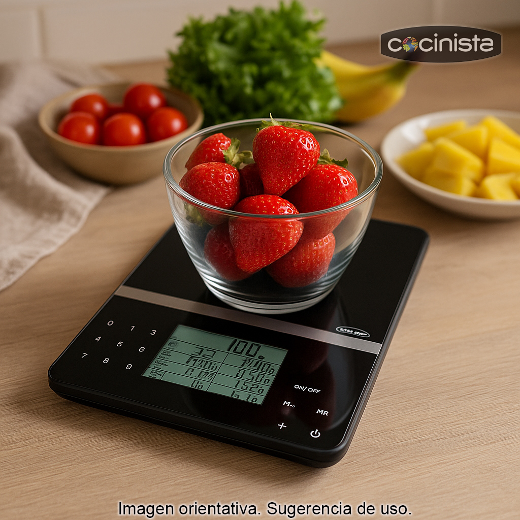- Tipo: balanza/báscula digital de cocina con información nutricional