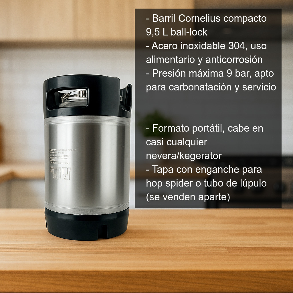 Barril tipo Corni (Corny) o Cornelius de tamaño compacto, con 9,5 litros de capacidad y conectores ball-lock. Es una opción ideal para servir cerveza de barril en casa, llevarla a reuniones o usarlo como barril de servicio para lotes pequeños, cold crash o carbonatación forzada con CO2.