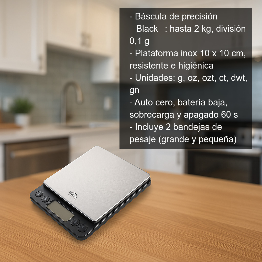 La báscula de precisión “Black” es una herramienta imprescindible para quienes necesitan pesajes exactos en cocina, repostería y elaboraciones donde cada décima cuenta. Con una capacidad máxima de 2 kg y una división de 0,1 g, permite medir con gran fiabilidad ingredientes en pequeñas cantidades, aditivos, especias, sales, levaduras, gelificantes o cualquier preparación que requiera máxima precisión.