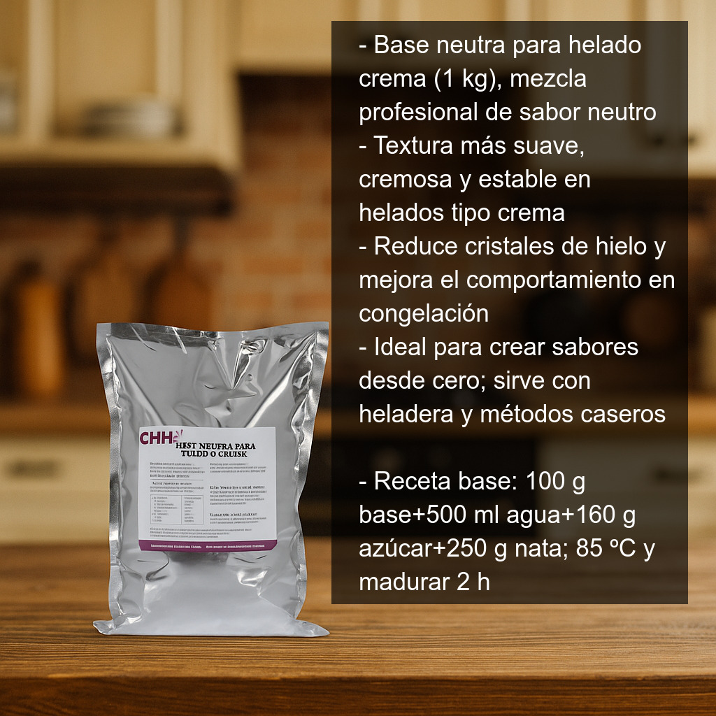 La base neutra para helado crema (1 kg) es una mezcla profesional de sabor neutro pensada para elaborar helados tipo crema con una textura más suave, cremosa y estable. Gracias a su formulación, ayuda a conseguir un helado más ligero en boca y con mejor comportamiento en congelación: reduce la formación de cristales de hielo, mejora la estructura y permite que el helado mantenga su calidad durante más tiempo en el congelador.