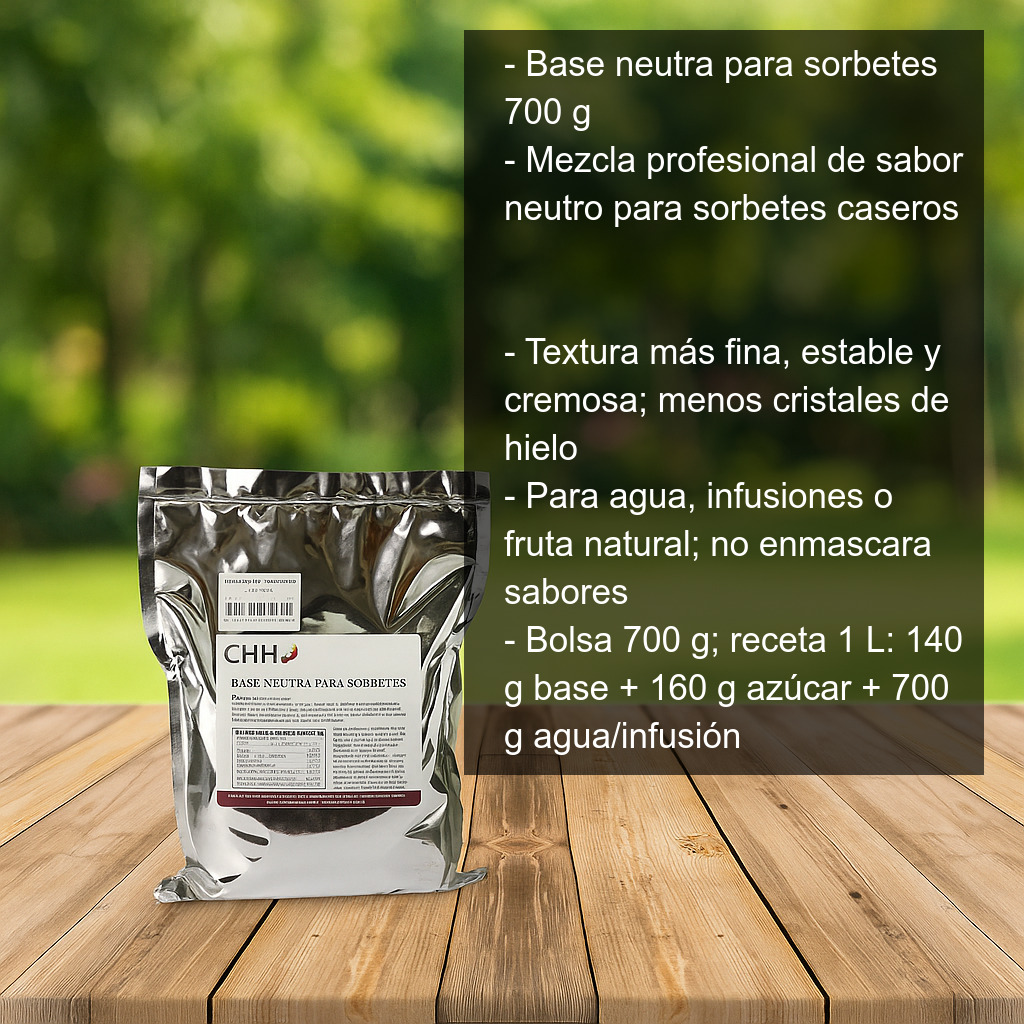 La base neutra para sorbetes (700 g) es una mezcla profesional de sabor neutro pensada para elaborar sorbetes caseros con una textura más fina, estable y cremosa, tanto si los preparas con agua, infusiones o fruta natural. Al no aportar sabor, es ideal para personalizar tus recetas con cítricos, frutas rojas, hierbas aromáticas, café, té, especias o cualquier ingrediente que quieras destacar.