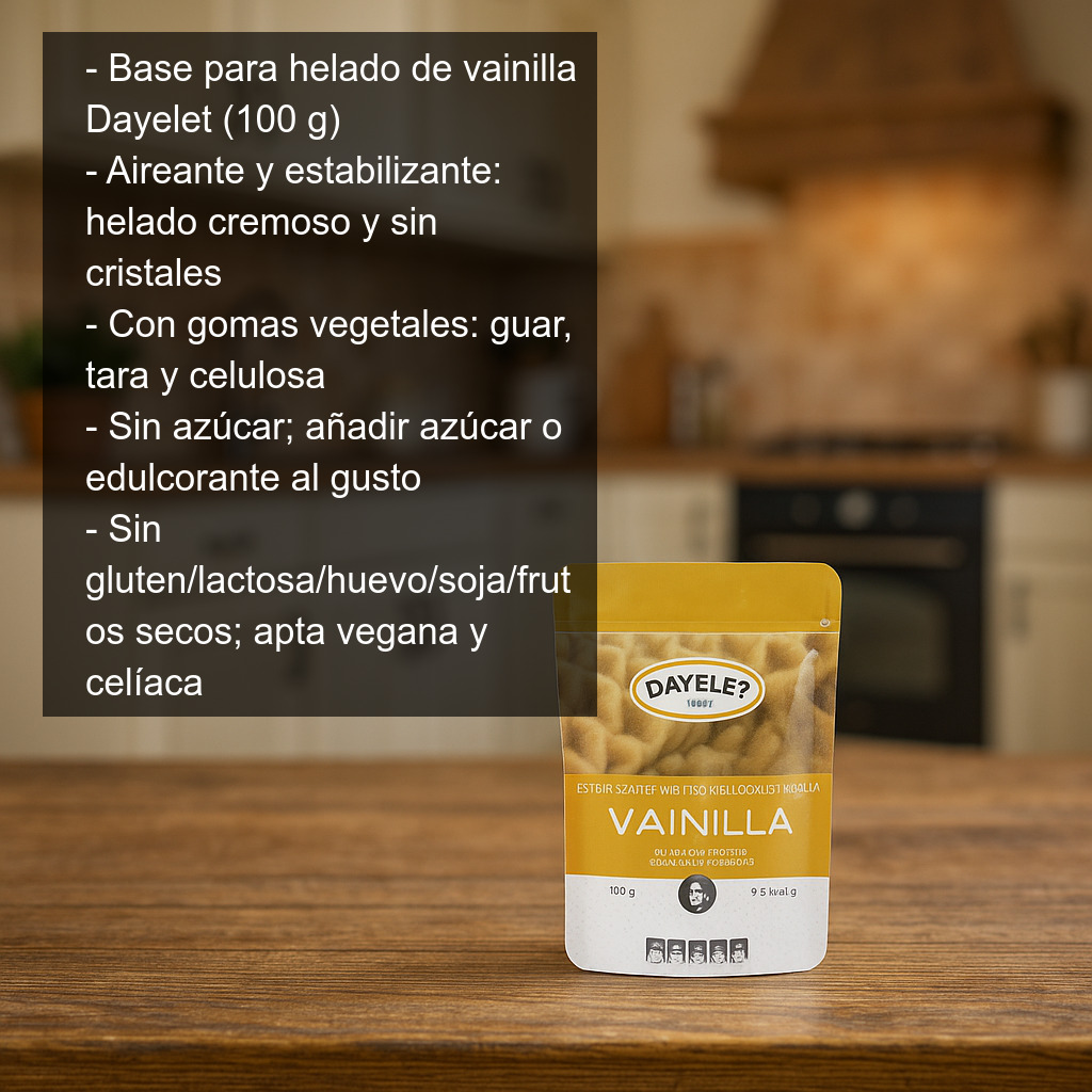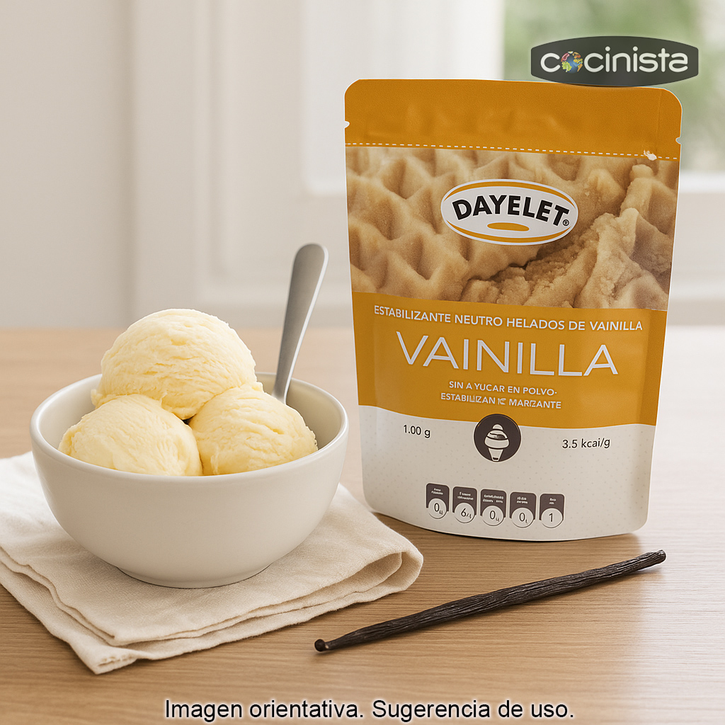 Consigue un helado de vainilla casero con textura profesional gracias a la Base para helado de vainilla Dayelet (100 g). Esta base actúa como aireante y estabilizante, ayudando a obtener helados más cremosos, ligeros y sin cristales de hielo, incluso cuando reduces la cantidad de grasa de la receta. Es una opción ideal si buscas un resultado fino y estable tanto en heladera como en preparaciones domésticas.