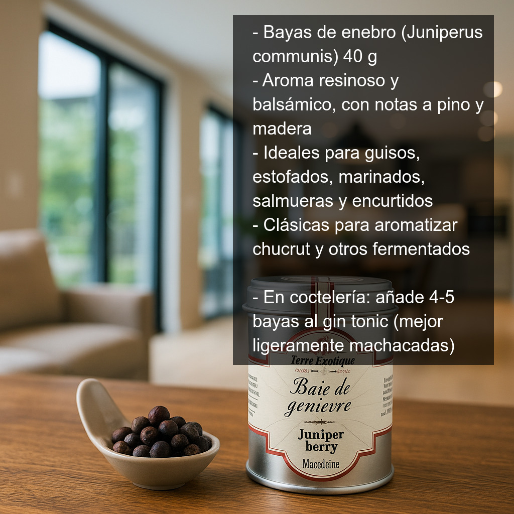 Las bayas de enebro (Juniperus communis) son un ingrediente imprescindible en la cocina y la coctelería por su aroma resinoso, con notas balsámicas y un gusto ligeramente ácido que recuerda al pino y a la madera. Estas bayas secas se utilizan desde hace siglos para perfumar guisos, marinados y encurtidos, aportando un toque fresco, silvestre y ligeramente amargo muy agradable.