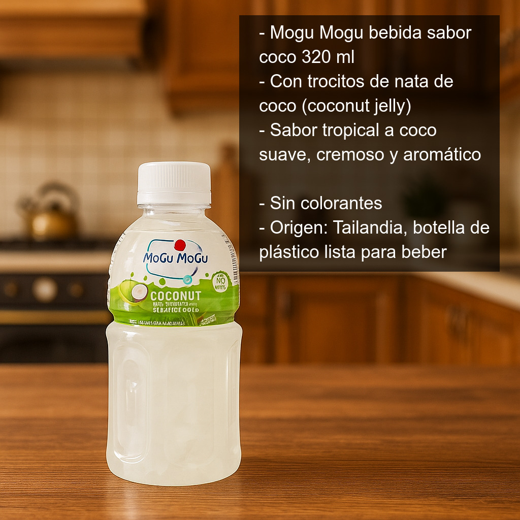 La bebida Mogu Mogu sabor a coco (320 ml) es una de esas bebidas asiáticas que sorprenden desde el primer sorbo: refrescante, divertida y con una textura única gracias a sus trocitos de nata de coco (también conocidos como coconut jelly). Es perfecta si te apetece algo diferente a un refresco tradicional y quieres disfrutar de una experiencia tropical en formato listo para beber.