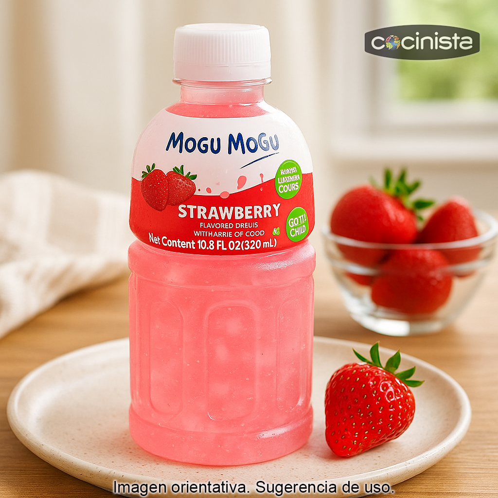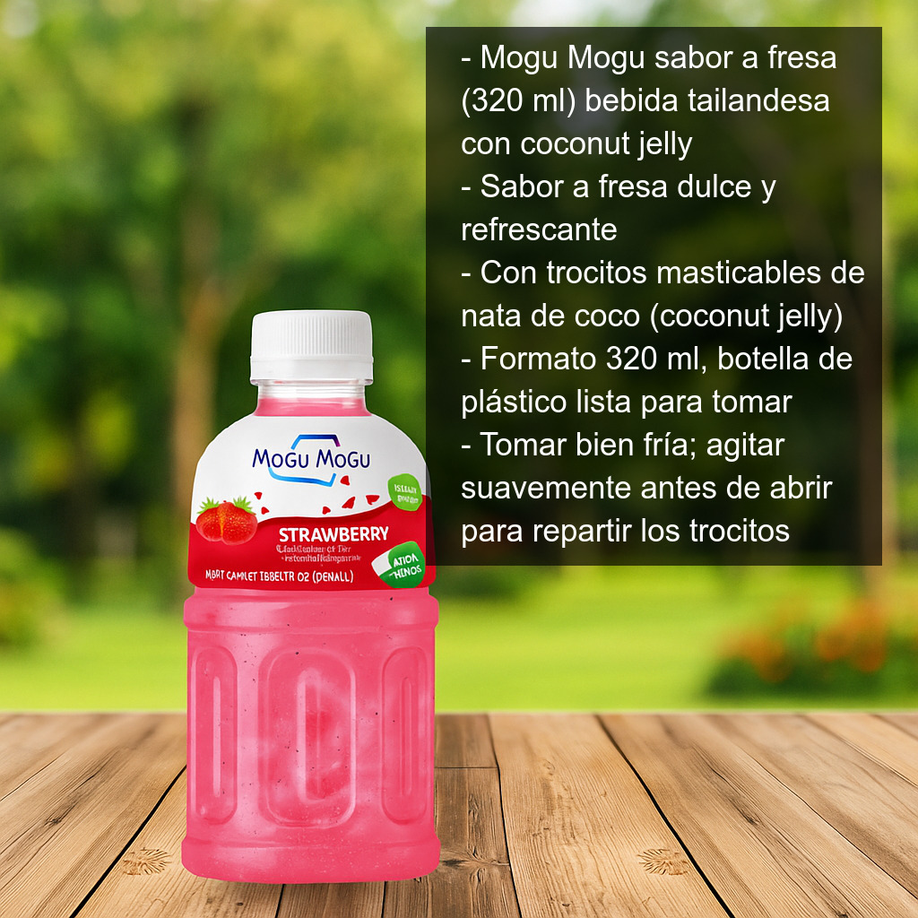 Mogu Mogu sabor a fresa (320 ml) es una bebida tailandesa refrescante y diferente que combina el sabor dulce y afrutado de la fresa con trocitos masticables de nata de coco (coconut jelly). El resultado es una experiencia a medio camino entre bebida y snack: sacia la sed y, a la vez, aporta una textura divertida que la hace inconfundible.