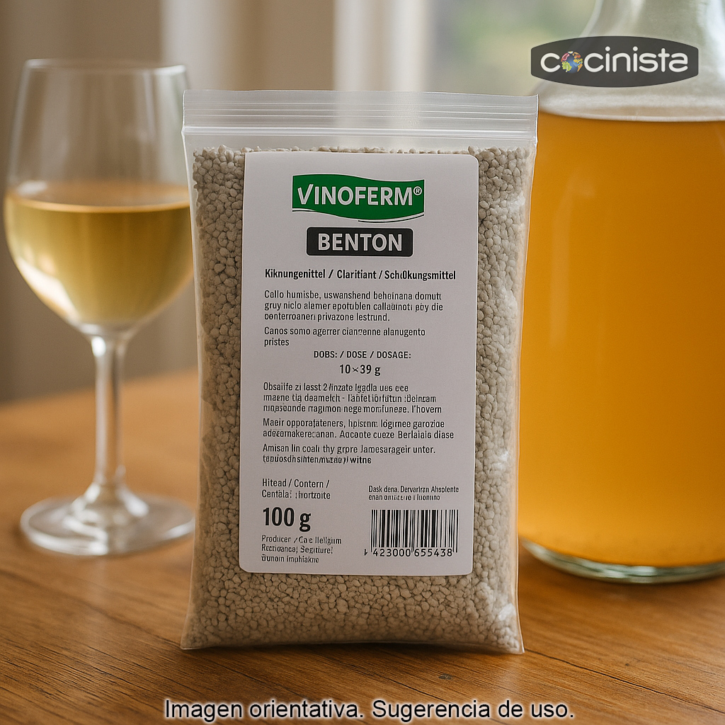 La bentonita se utiliza habitualmente para mejorar la limpidez y favorecer la estabilidad, ya que puede ayudar a reducir compuestos responsables de velos y enturbiamientos. Es un producto muy empleado tanto en elaboraciones caseras como en pequeñas producciones, por su eficacia y facilidad de uso cuando se prepara correctamente.