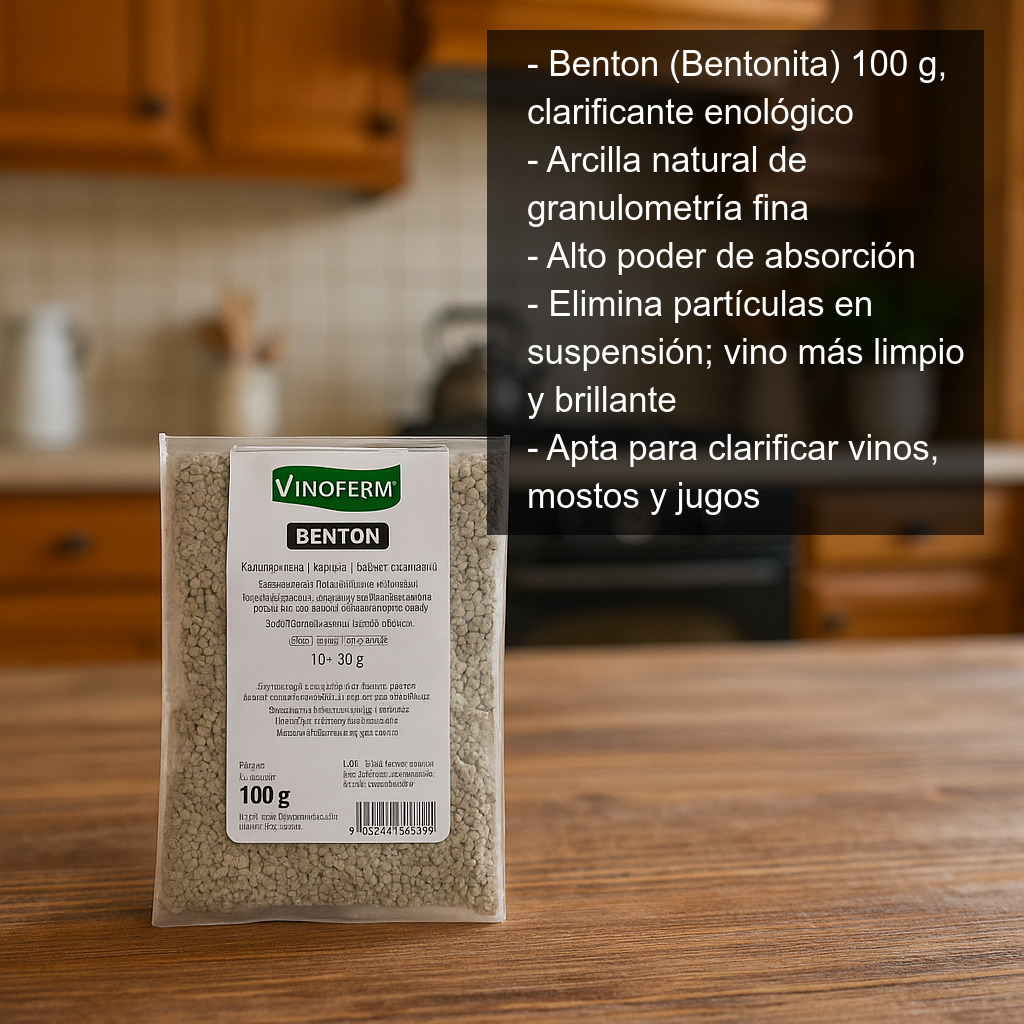 Benton (Bentonita) 100 g es una arcilla natural de uso enológico especialmente indicada para la clarificación de vino gracias a su granulometría fina y a su alto poder de absorción. Actúa como agente clarificante eliminando partículas en suspensión y ayudando a obtener un vino más limpio, brillante y estable. También es adecuada para el clarificado previo de vinos y zumos (mostos y jugos), facilitando la sedimentación de turbideces.