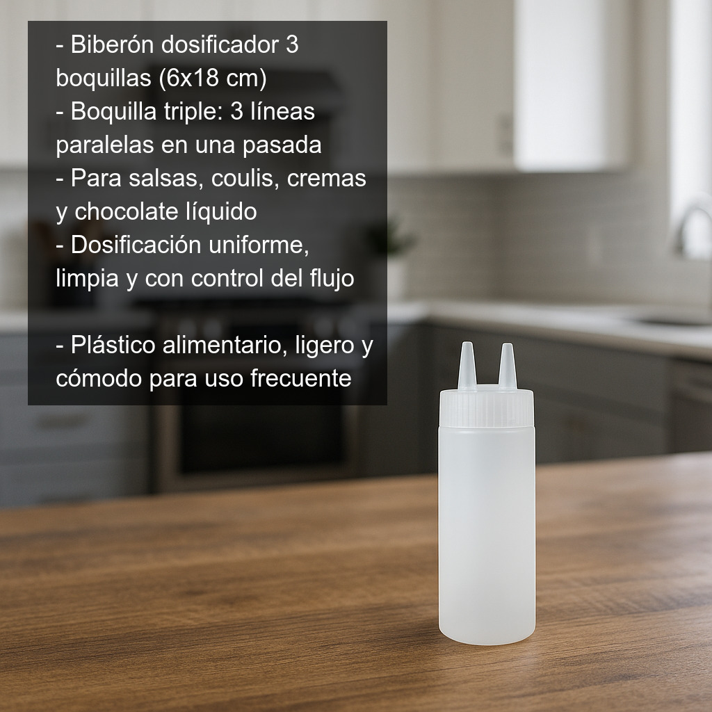 Si buscas un biberón de cocina para salsas que te ayude a mejorar la presentación de tus platos con rapidez y consistencia, este modelo de tres boquillas es una opción práctica y muy efectiva.