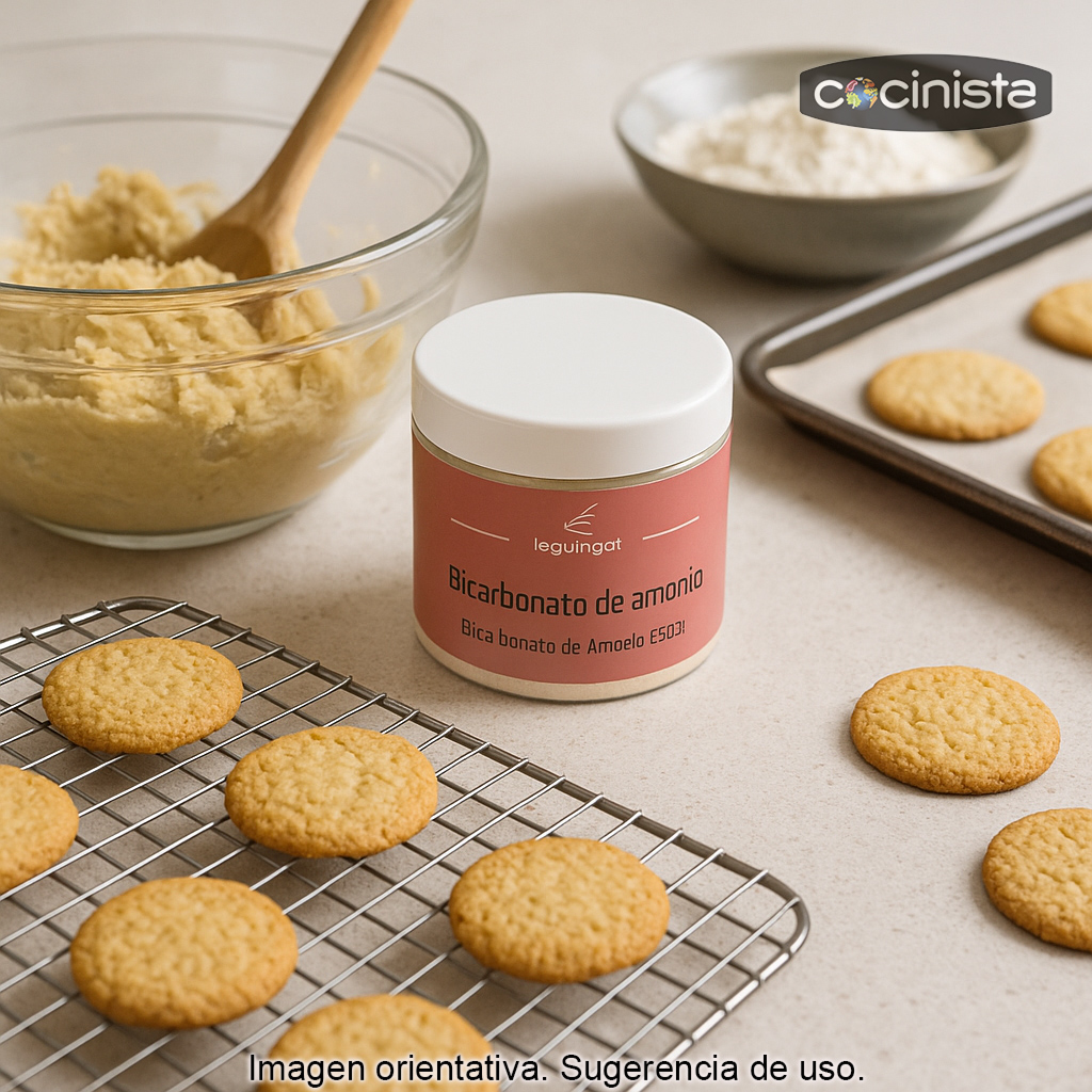 El bicarbonato de amonio (también conocido como amoniaco para repostería o hartshorn) es un agente leudante tradicional muy utilizado como mejorador de masas en panadería y, sobre todo, en repostería. Al calentarse en el horno, se descompone liberando gases que ayudan a que la masa suba y quede más ligera.