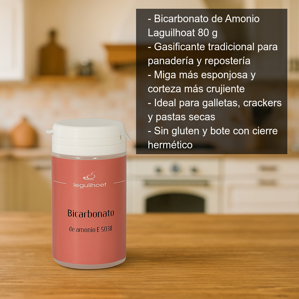 El bicarbonato de amonio (también conocido como ammonium bicarbonate o hartshorn) es un gasificante tradicional muy utilizado en panadería y repostería como mejorador de masas. Al calentarse en el horno se descompone liberando gases que ayudan a que la masa suba y quede más ligera. Durante el horneado puede aparecer un olor a amoniaco, pero desaparece por completo una vez finalizada la cocción y enfriado el producto.