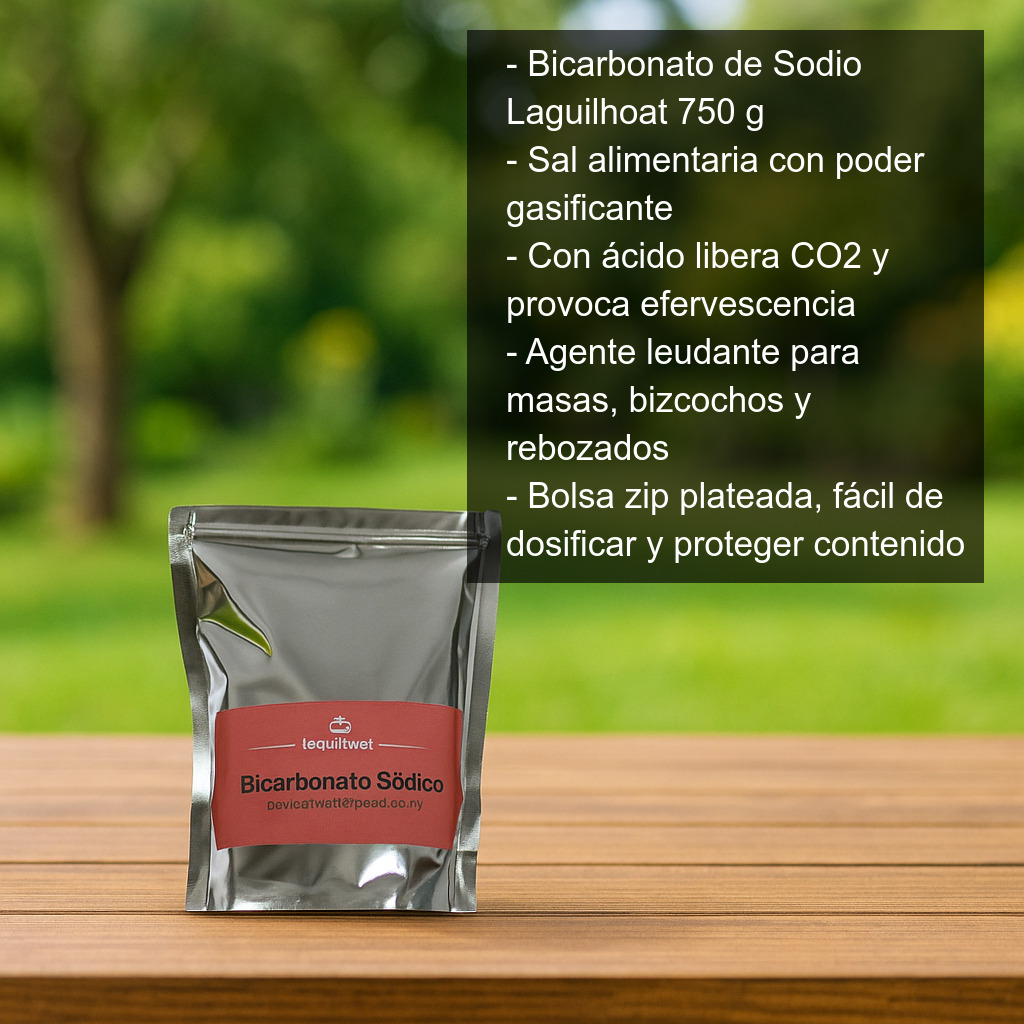 El Bicarbonato de Sodio Laguilhoat se presenta en una bolsa zip plateada con 750 g de producto, ideal para un uso frecuente en cocina y repostería, manteniendo el contenido bien protegido y fácil de dosificar.