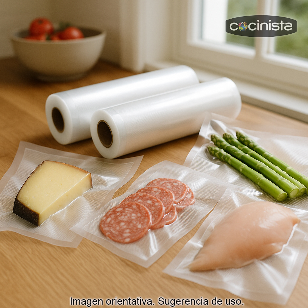 Esta bobina es compatible con máquinas de envasado al vacío Lacor y, en general, con la mayoría de envasadoras domésticas de succión externa (las habituales que sellan bolsas gofradas). Si tu envasadora trabaja con bolsas gofradas/estriadas, este rollo te permitirá crear bolsas del tamaño que necesites.