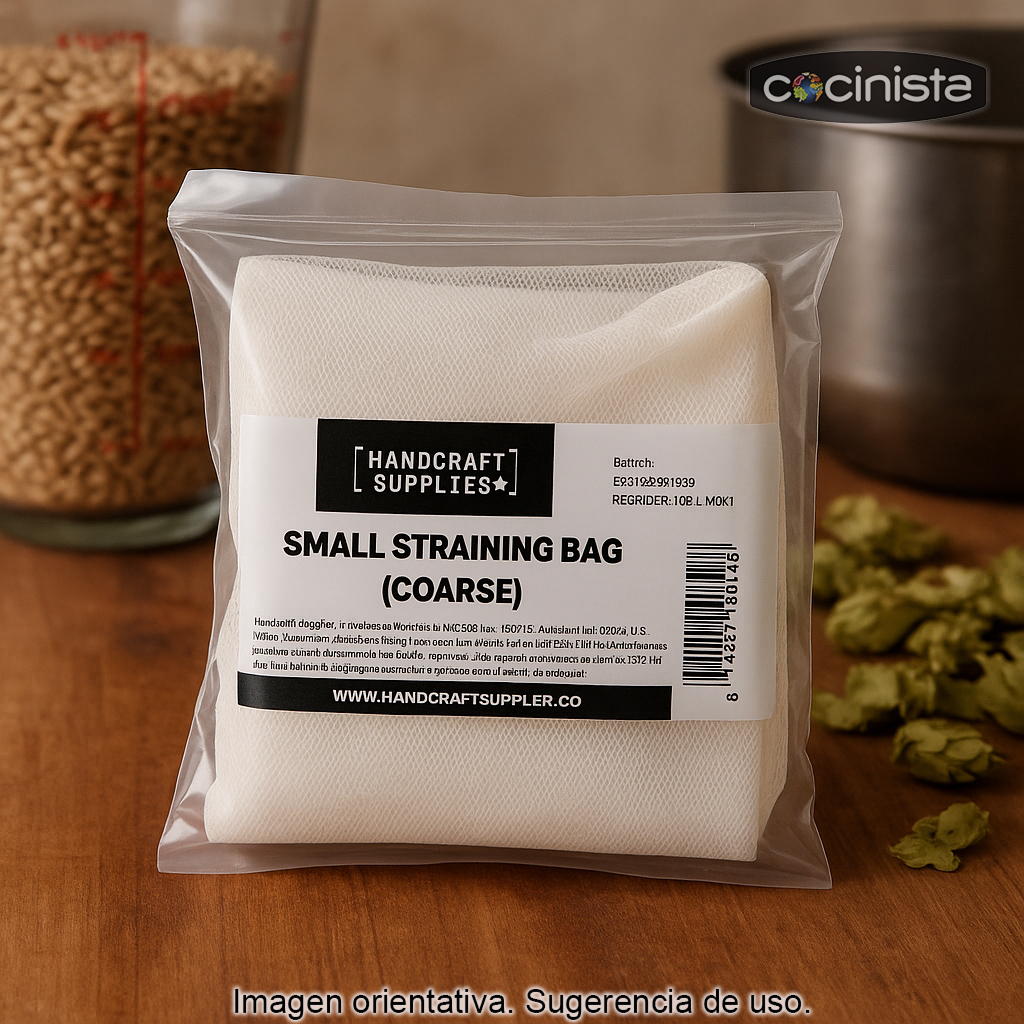 Con este volumen, resulta adecuada para realizar, por ejemplo, el macerado de una partida de hasta 2–3 kg de malta (según el equipo y la relación agua/grano). También puede utilizarse como bolsa para lúpulo durante la cocción, ayudando a mantener el lúpulo contenido y facilitando la limpieza posterior.