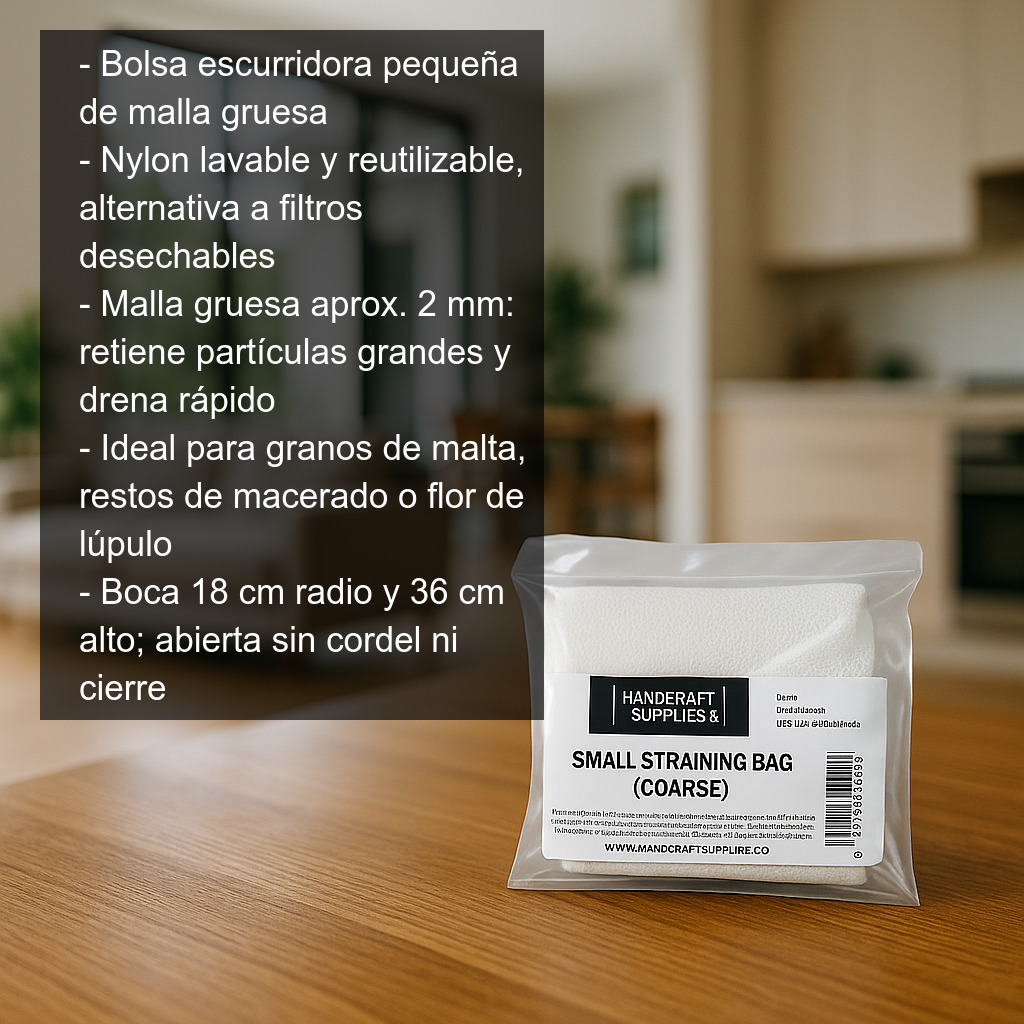 La bolsa escurridora pequeña de malla gruesa es un accesorio práctico y resistente para escurrir, colar y realizar un filtrado primario de mostos y otros líquidos en elaboraciones caseras. Está fabricada en nylon y cuenta con una malla gruesa de aproximadamente 2 mm, pensada para retener partículas grandes y permitir un paso rápido del líquido, agilizando el trabajo y evitando atascos.