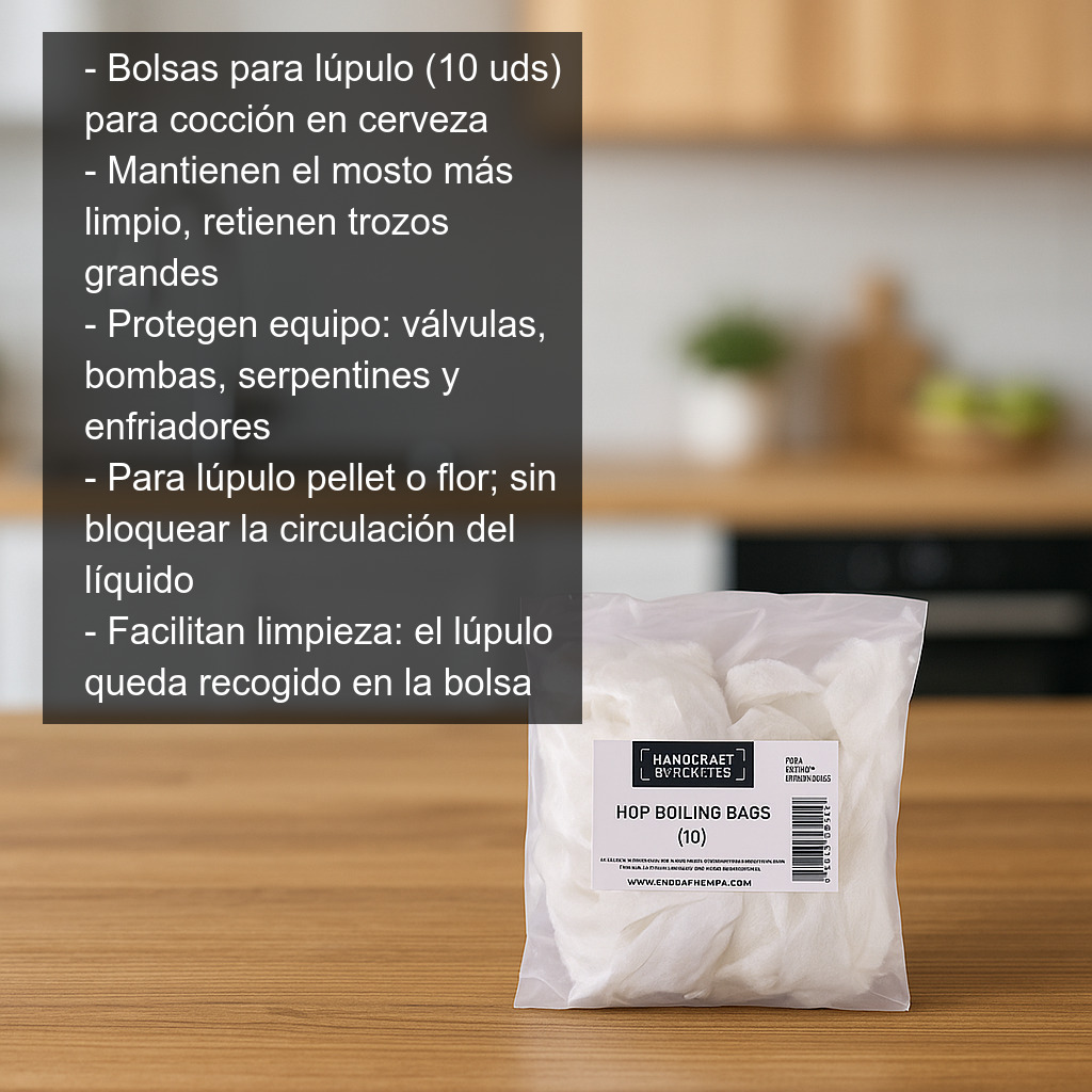 Bolsas especialmente pensadas para la cocción de lúpulo durante la elaboración de cerveza (homebrewing). Estas bolsas para lúpulo ayudan a mantener el mosto más limpio, evitando que pasen trozos grandes de lúpulo a la olla o al fermentador, lo que contribuye a proteger tu equipo (válvulas, bombas, serpentines y enfriadores) y a reducir la aparición de sabores indeseados asociados a un exceso de materia vegetal en suspensión.
