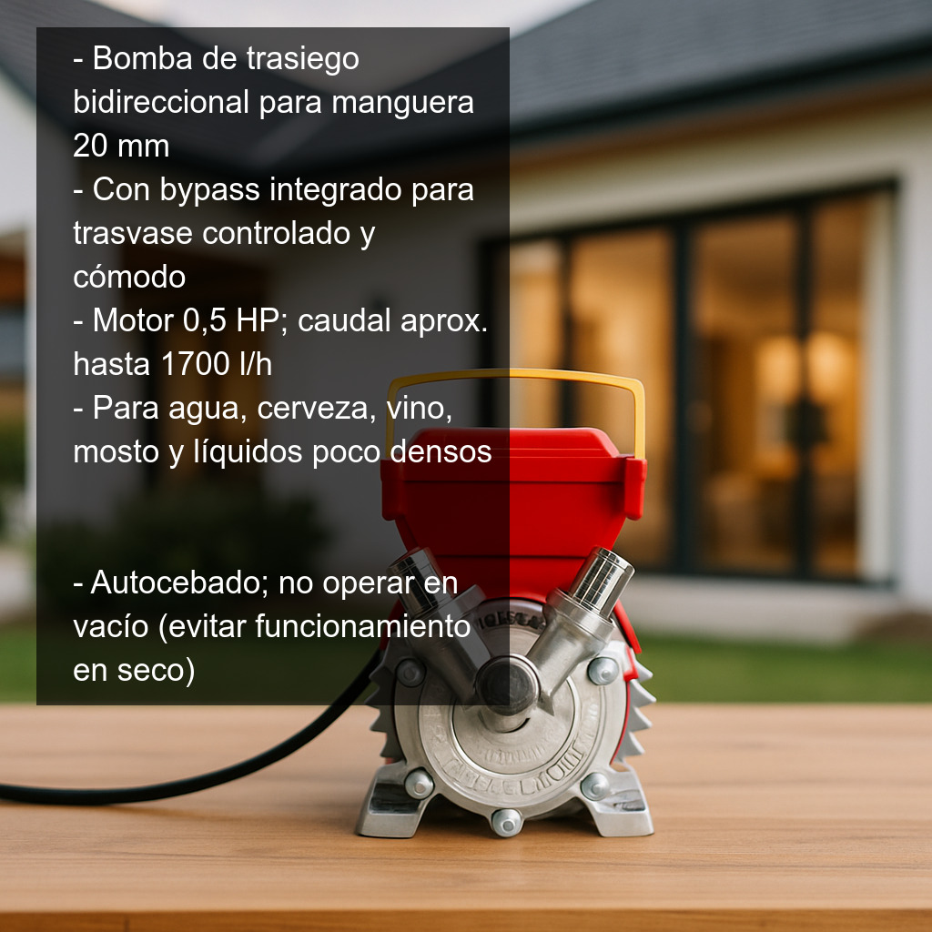 Equipada con un motor de 0,5 HP, ofrece un caudal aproximado de 1700 l/h (según condiciones de instalación), lo que la convierte en una bomba adecuada para tareas de trasiego rápidas y continuas. Está diseñada para trabajar con mangueras de 20 mm, un diámetro habitual en instalaciones de trasvase de cerveza, vino y otros líquidos alimentarios.