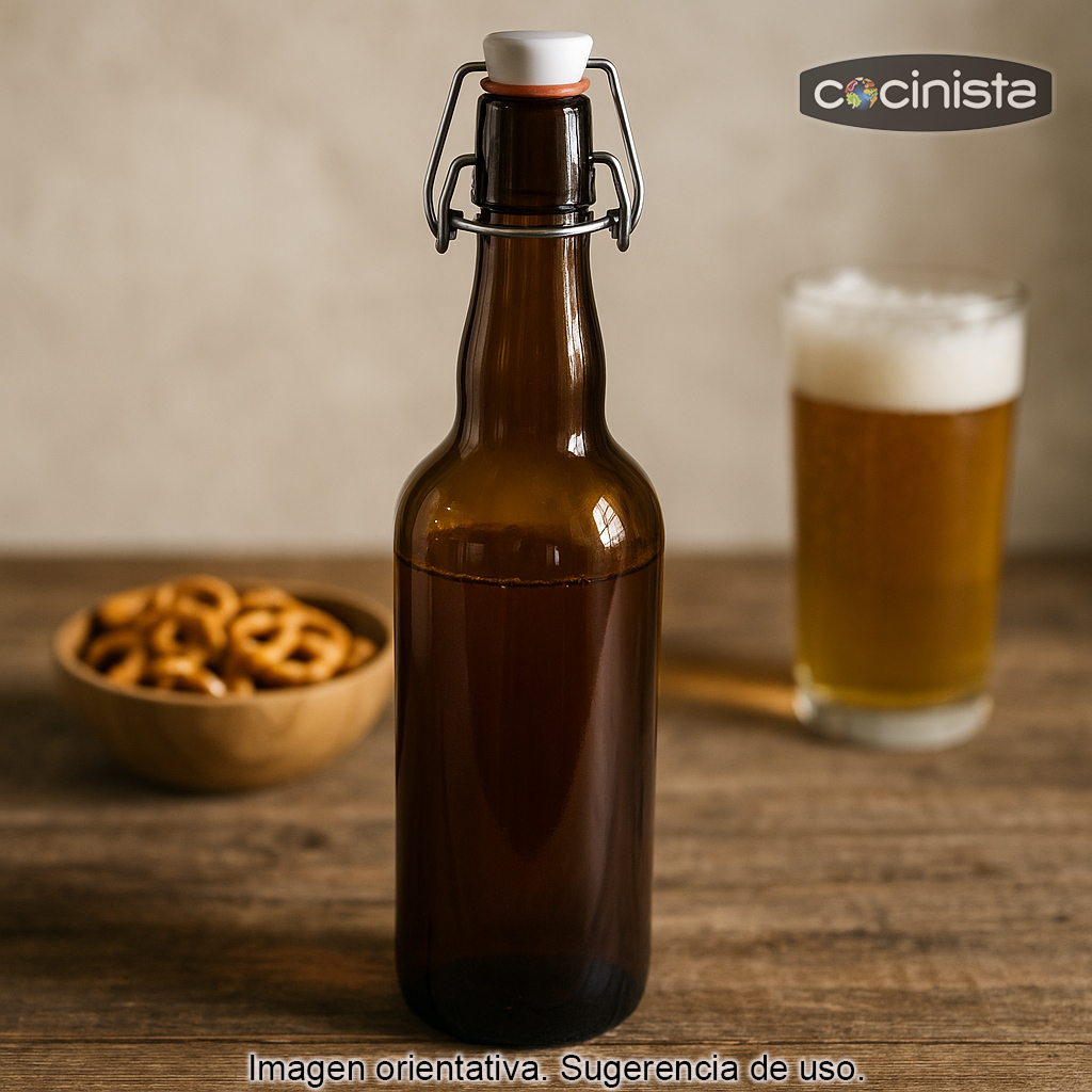 Gracias al tapón mecánico (cierre con junta), no necesitas chapadora ni enchapado para cerrar la botella: basta con colocar el tapón y asegurar el mecanismo. Esto facilita el embotellado, permite abrir y cerrar con comodidad y resulta muy práctico para quienes elaboran cerveza en casa o buscan una solución reutilizable.