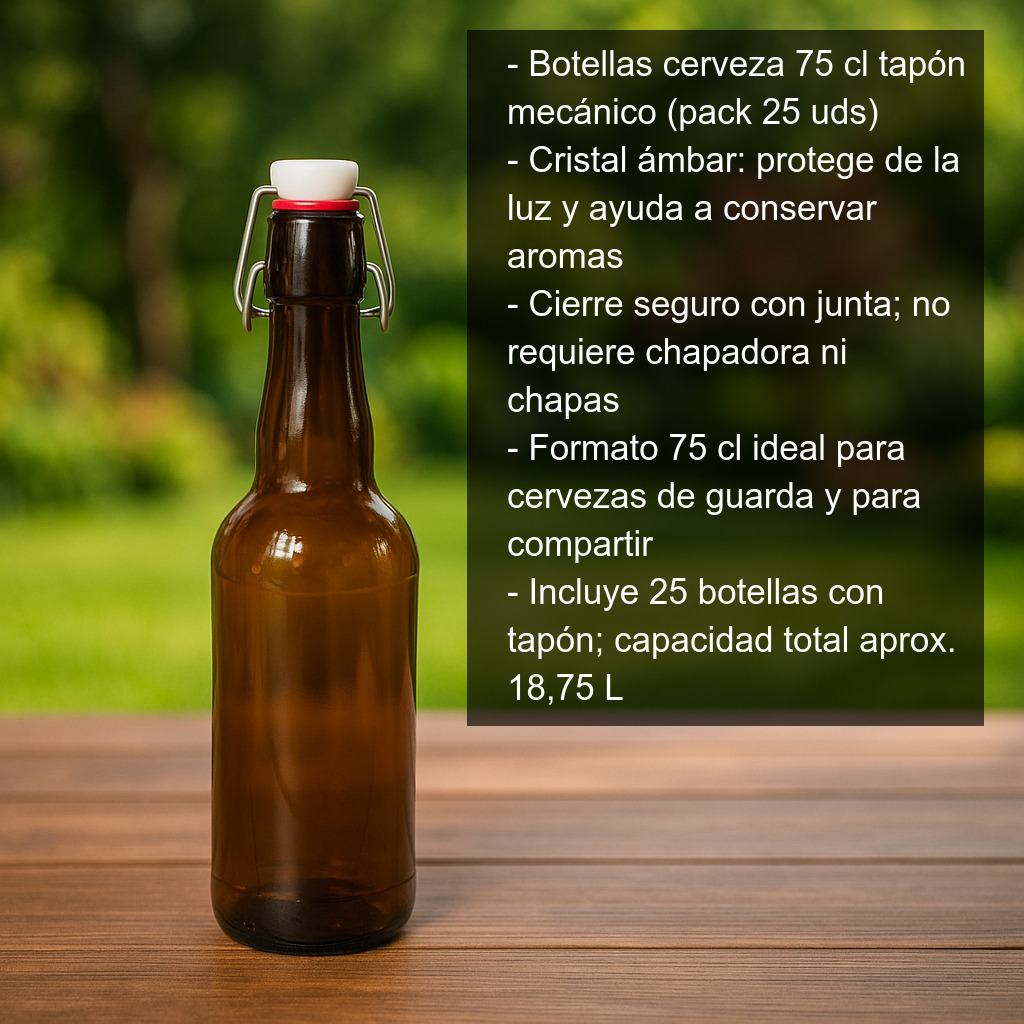 Botellas para cerveza de 75 cl con tapón mecánico (pack 25 uds), perfectas para embotellar, conservar y servir cerveza artesanal en casa con un acabado profesional. Estas botellas de cristal son una opción excelente para cervezas con gas (carbonatadas) y también para bebidas sin gas, ya que ofrecen un cierre seguro y una buena protección del contenido.