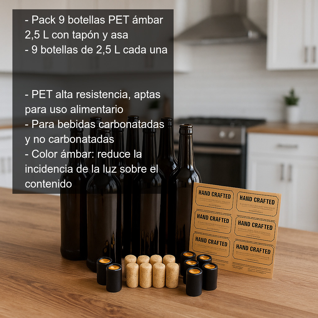 Este pack de 12 botellas para vino de 750 ml es la opción ideal para embotellar, conservar y presentar tus vinos caseros con un acabado profesional. Incluye botellas de vidrio marrón (tipo ámbar), tapones de corcho, cápsulas embellecedoras negras y un juego de etiquetas adhesivas para identificar cada botella.