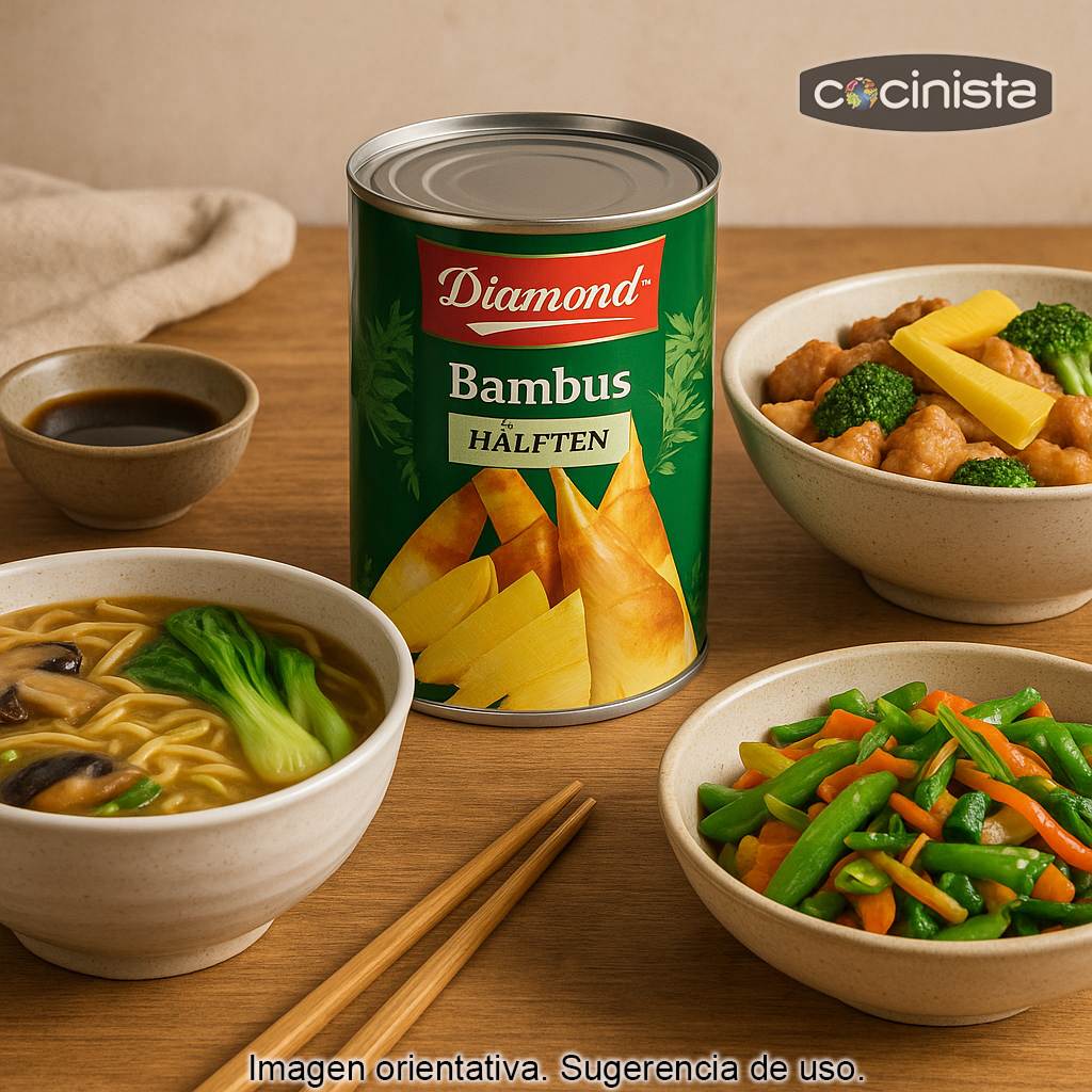 Los brotes de bambú en mitades son un ingrediente clásico de la cocina china y de muchas recetas de cocina asiática. Destacan por su textura crujiente y su sabor suave, perfecto para aportar contraste a platos con salsas, caldos y salteados. Al venir cortados en mitades, resultan muy cómodos para incorporar directamente a tus preparaciones, manteniendo una presencia más “generosa” en el plato.