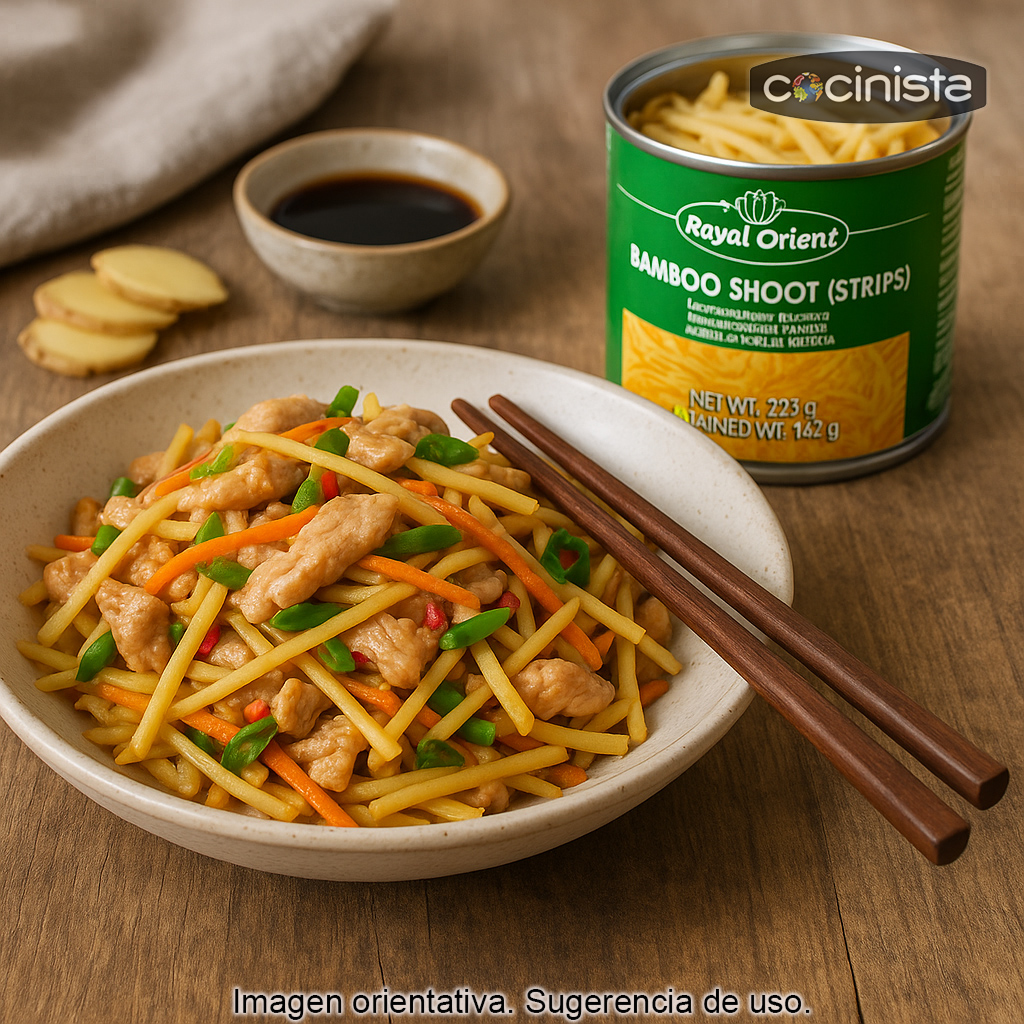 Los brotes de bambú en tiras son un ingrediente clásico de la cocina asiática, apreciado por su sabor suave y delicado y por su textura crujiente, perfecta para aportar contraste a salteados, sopas y guisos. Vienen cortados en tiras finas y conservados en lata para que puedas utilizarlos de forma rápida y cómoda en tus recetas.