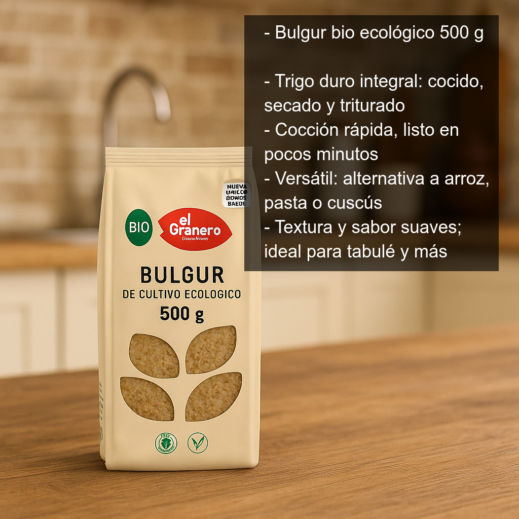 El bulgur bio es un cereal integral elaborado a partir de trigo duro que se cuece parcialmente, se seca y se tritura. Este proceso tradicional permite obtener un ingrediente muy práctico, de cocción rápida y con una textura ligera y agradable. Nuestro bulgur de agricultura ecológica se presenta en bolsa de 500 g, ideal para tener siempre a mano una alternativa versátil al arroz, la pasta o el cuscús.