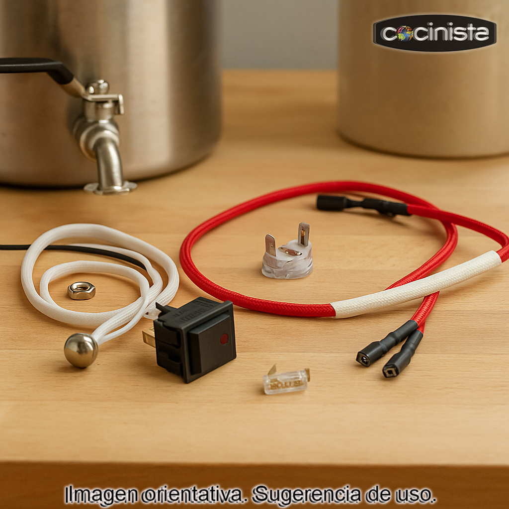 Incluye el conjunto de cableado con sus interruptores y fusibles, pensado para reemplazar los componentes eléctricos originales del equipo. Es una solución práctica cuando aparecen síntomas como cortes intermitentes, fusibles que saltan con frecuencia, conectores deteriorados o problemas en el encendido.