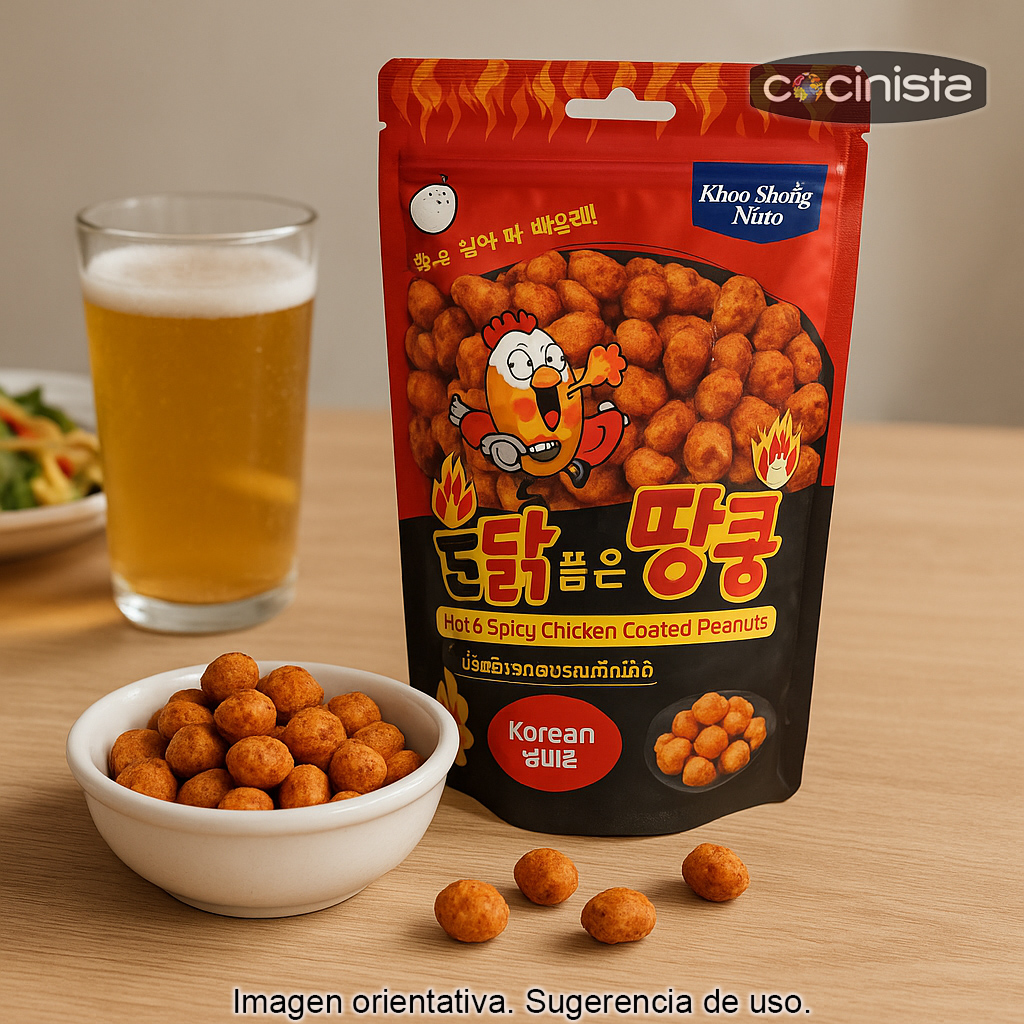 Estos cacahuetes recubiertos picantes destacan por su combinación de sabor intenso, especias de estilo coreano y una textura adictiva. Un bocado diferente, con personalidad, pensado para amantes de los aperitivos con un toque internacional.